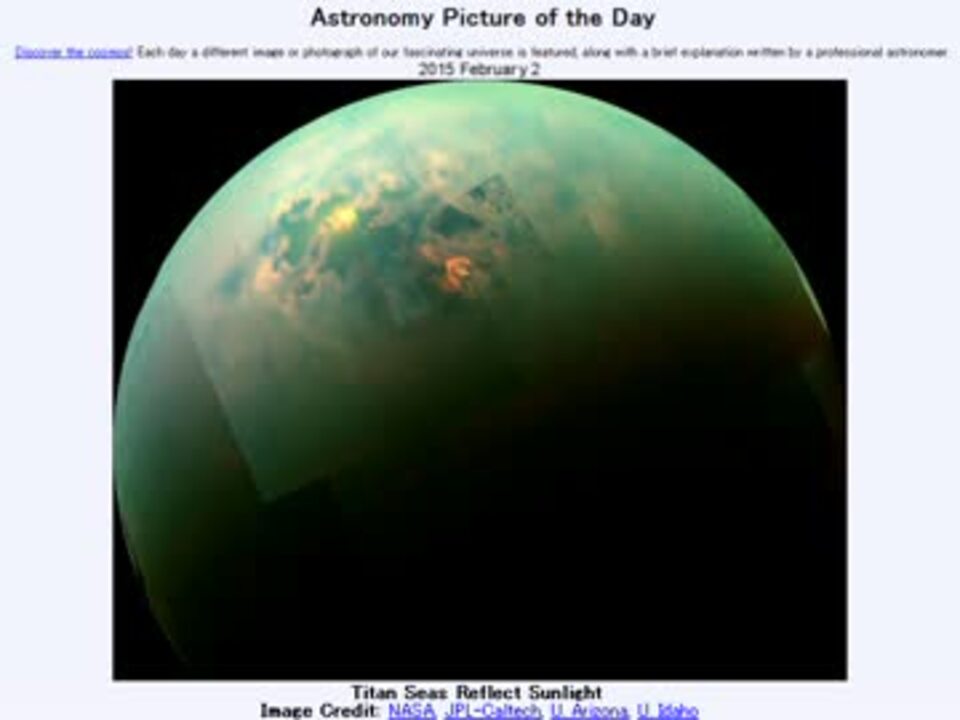 <b>2015年 2月2日 Astronomy Picture of the Day<br />Titan Seas Reflect Sunlight 「日光を反射するタイタンの海」</b><br /><br />APODとはNASAの天文学者が、毎日天文に関する画像に説明を添えて公開しているサイトです。<br />英語の勉強に読んでます。間違いがあれば指摘頂けると嬉しいです。<br /><br /><b>美しい写真と原文</b><br /><a href="http://apod.nasa.gov/apod/ap150202.html" target="_blank" rel="noopener nofollow">http://apod.nasa.gov/apod/ap150202.html</a><br /><b>お借りした音源</b><br /><a href="https://commons.nicovideo.jp/works/nc98498" target="_blank" rel="noopener">nc98498</a>「潮風」 by 茜岬ちのり<br /><br />APODreadingマイリスト <a href="https://www.nicovideo.jp/mylist/32170692" target="_blank" rel="noopener">mylist/32170692</a> (<a href="https://www.nicovideo.jp/watch/sm25559798" class="watch">sm25559798</a><前日 翌日><a href="https://www.nicovideo.jp/watch/sm25574937" class="watch">sm25574937</a>)<br /><br />Twitter:Cc_jabberwock <br /><br />転載はご遠慮下さい。解らない事が有ったら気軽に聞いてみて下さい。調べてきます<br />edgeさんいつもありがとうございますm(_ _)m