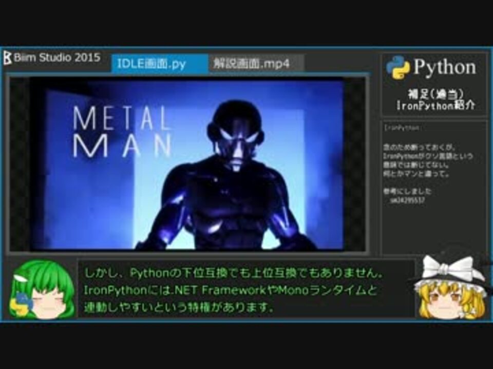 前回のリバウンドでネタ重点。サムネは…IronPythonの擬人化的な?<br /><br />前回:<a href="https://www.nicovideo.jp/watch/sm25535996" class="watch">sm25535996</a> 次:<a href="https://www.nicovideo.jp/watch/sm25611283" class="watch">sm25611283</a><br />本シリーズマイリスト: <a href="https://www.nicovideo.jp/mylist/48142272" target="_blank" rel="noopener">mylist/48142272</a><br />今まで上げたやつ: <a href="https://www.nicovideo.jp/mylist/42331613" target="_blank" rel="noopener">mylist/42331613</a><br /><br />2015/2/16追記: ダイスさん宣伝ありがとナス!