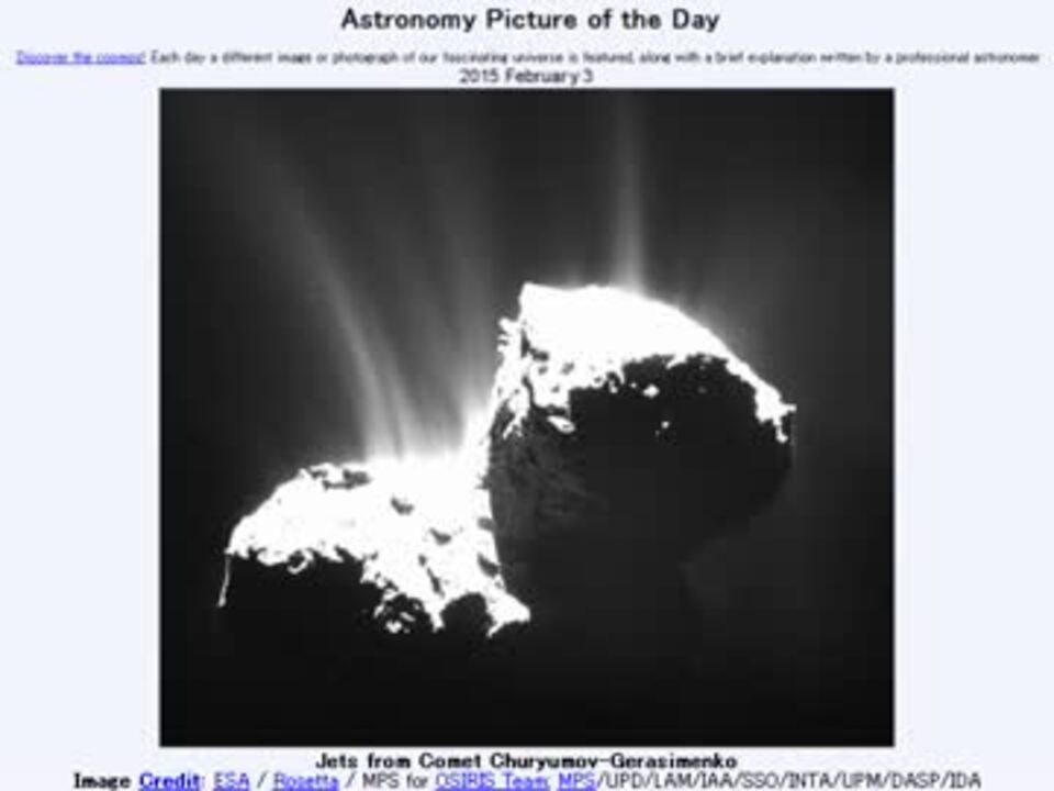 <b>2015年 2月3日 Astronomy Picture of the Day<br />Jets from Comet Churyumov-Gerasimenko 「チュリュモフ・ゲラシメンコ彗星の何本ものジェット」</b><br /><br />APODとはNASAの天文学者が、毎日天文に関する画像と解説を公開しているサイトです。<br />英語の勉強に読んでます。<br /><br /><b>美しい写真と原文</b><br /><a href="http://apod.nasa.gov/apod/ap150203.html" target="_blank" rel="noopener nofollow">http://apod.nasa.gov/apod/ap150203.html</a><br /><b>お借りした素材</b>Flickrより<br />"Comet Lovejoy (C/2014 Q2) and the Pleiades (M45)" by theilr<br />"4/366(Y2) - Research" by Nomadic Lass<br />NHKクリエイティブライブラリより<br />"流星2"<br /><b>お借りした音源</b><br /><a href="https://commons.nicovideo.jp/works/nc103329" target="_blank" rel="noopener">nc103329</a>「The edge of a pond」 by SOUNDORBIS<br /><br />APODreadingマイリスト <a href="https://www.nicovideo.jp/mylist/32170692" target="_blank" rel="noopener">mylist/32170692</a> (<a href="https://www.nicovideo.jp/watch/sm25568245" class="watch">sm25568245</a><前日 翌日><a href="https://www.nicovideo.jp/watch/sm25585700" class="watch">sm25585700</a>)<br /><br />転載はご遠慮下さい。<br />解説ありがとうございます。上に出して頂けると文字が重ならずに済むかと思います。