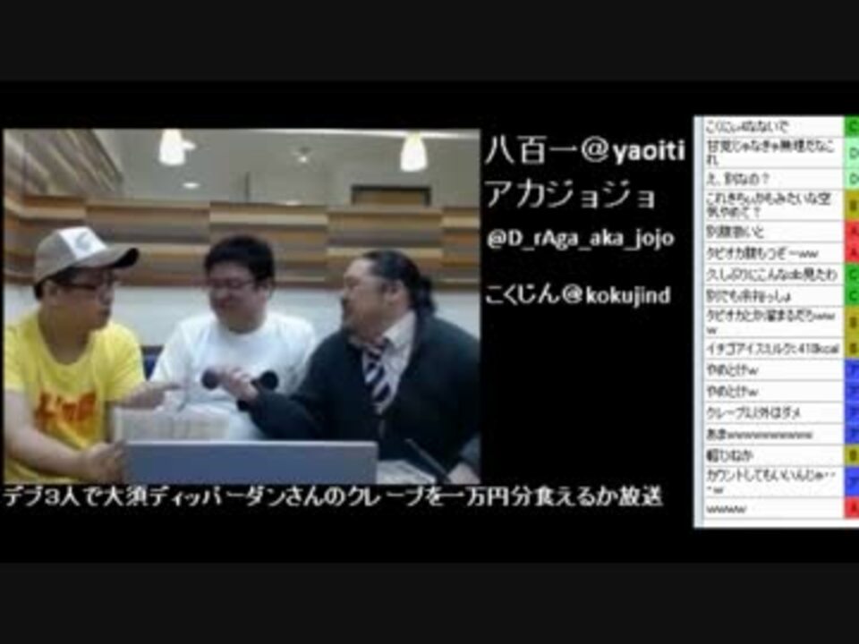 こくじんTV(co1410443)における大食い配信です(<a href="https://live.nicovideo.jp/watch/lv213249610" target="_blank" rel="noopener">lv213249610</a>)<br />【大食い三銃士】デブ3人でクレープだけで一万円分食べる放送【大須ディッパーダン】<br />大人気キラーコンテンツ!<br />デブ3人が大須のディッパーダンさんでクレープのみで一万円分食う企画!<br /><br />ディッパーダン<br /><a href="http://www.orangefoodcourt.co.jp/dipper/dip_index.html" target="_blank" rel="noopener nofollow">http://www.orangefoodcourt.co.jp/dipper/dip_index.html</a><br /><br />1/2→<a href="https://www.nicovideo.jp/watch/sm25766517" class="watch">sm25766517</a> 2/2→<a href="https://www.nicovideo.jp/watch/sm25766570" class="watch">sm25766570</a><br />他の→<a href="https://www.nicovideo.jp/mylist/33661707" target="_blank" rel="noopener">mylist/33661707</a>