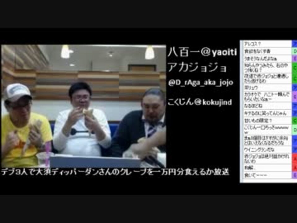 こくじんTV(co1410443)における大食い配信です(<a href="https://live.nicovideo.jp/watch/lv213249610" target="_blank" rel="noopener">lv213249610</a>)<br />【大食い三銃士】デブ3人でクレープだけで一万円分食べる放送【大須ディッパーダン】<br />大人気キラーコンテンツ!<br />デブ3人が大須のディッパーダンさんでクレープのみで一万円分食う企画!<br /><br />ディッパーダン<br /><a href="http://www.orangefoodcourt.co.jp/dipper/dip_index.html" target="_blank" rel="noopener nofollow">http://www.orangefoodcourt.co.jp/dipper/dip_index.html</a><br /><br />1/2→<a href="https://www.nicovideo.jp/watch/sm25766517" class="watch">sm25766517</a> 2/2→<a href="https://www.nicovideo.jp/watch/sm25766570" class="watch">sm25766570</a><br />他の→<a href="https://www.nicovideo.jp/mylist/33661707" target="_blank" rel="noopener">mylist/33661707</a>