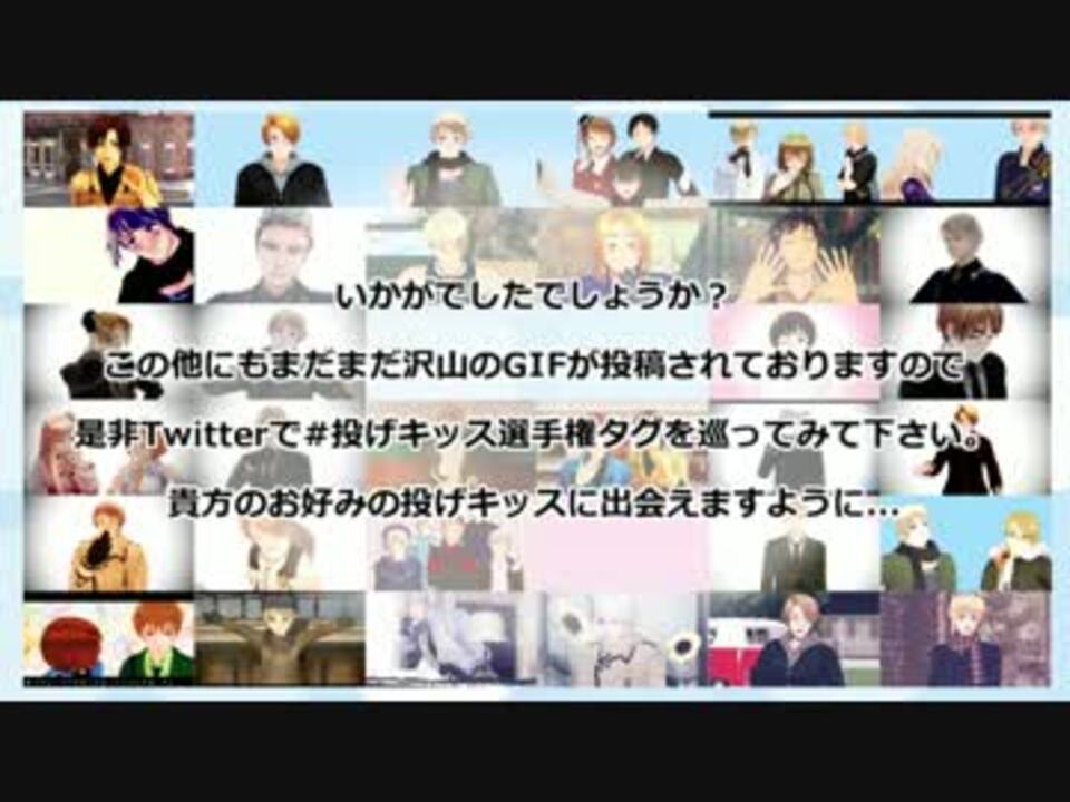<br>素敵なタグだったので、周りの人を巻き込んで繋げてみました!<br>ご協力頂きました皆様ありがとうございます。<br><br><s>拙いものですが自分の投稿した投げキッスモーション配布します。</s><br>モーション配布終了します。<br>既にDL済の方は規約をもとにお使い下さい。<br><br>Please do not re-upload this video.<br><br><span style="color: red;">関連動画やモデラー様、参加者様にご迷惑のかかる言動は謹んで下さい。</span><br><br>※BGMはコモンズよりhito様からお借りしています。<br> 尚、一般未配布のテストモデルはオーストラリアさんとなります。<br> 記載ミス大変失礼致しました。<br> (綴りミスもすいません)<br>彩貴様、世界領様、スカリン様、世界領普及委員会様、宣伝ありがとうございます!
