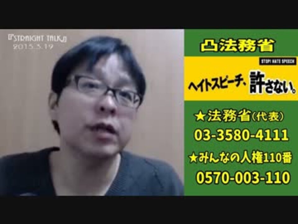 ★桜井誠の『Straight Talk』(2015/3/19)より。◆ヘイトスピーチにはガイドラインも定義もありません。電話、ファックス、メールで、法務省と大阪市に、意見、疑問、抗議の声をどんどんお願いします。◆【法務省】みんなの人権110番 電話(0570-003-110) ※ご意見・ご提案→<a href="http://www.moj.go.jp/mail.html" target="_blank" rel="noopener nofollow">http://www.moj.go.jp/mail.html</a> ◆【大阪市】詳細は『保守速報』→<a href="http://goo.gl/h8DBfo" target="_blank" rel="noopener nofollow">http://goo.gl/h8DBfo</a> ※人権企画課・電話(06-6208-7619 ) ※大阪市役所→<a href="http://www.city.osaka.lg.jp/(06-6208-8181" target="_blank" rel="noopener nofollow">http://www.city.osaka.lg.jp/(06-6208-8181</a> 代表) ◆『そよ風』HP→<a href="http://urx.nu/iCZs" target="_blank" rel="noopener nofollow">http://urx.nu/iCZs</a> ◆「ヘイトスピ-チ規制」問題で法務省・人権擁護局に電凸 →<a href="http://urx.nu/iCYA" target="_blank" rel="noopener nofollow">http://urx.nu/iCYA</a> ◆在特会は公式チャンネルとなりました。→<a href="http://ch.nicovideo.jp/zaitoku" target="_blank" rel="noopener nofollow">http://ch.nicovideo.jp/zaitoku</a> ◆YouTubeに投稿しました。→<a href="http://urx.nu/iCZ4" target="_blank" rel="noopener nofollow">http://urx.nu/iCZ4</a> 広告ありがとうございます。