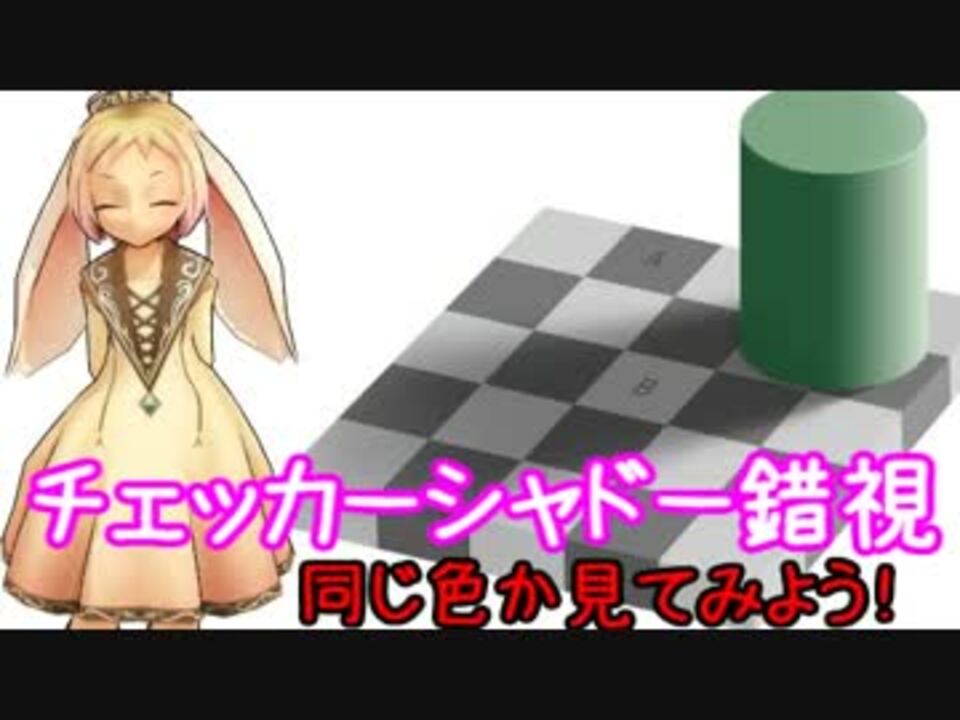 かなり前にやった<a href="https://www.nicovideo.jp/watch/sm18585933" class="watch">sm18585933</a>のチェッカーシャドーを詳しくやってみました<br>錯視の種類<br>チェッカーシャドー錯視 <br>ムンカー錯視 <br><br>UP動画マイリスト<br>ほのぼの+ダンス系マイリスト <a href="https://www.nicovideo.jp/mylist/29772836" target="_blank" rel="noopener">mylist/29772836</a><br>たこうさ教養講座ネギ入り&その他 <a href="https://www.nicovideo.jp/mylist/34339376" target="_blank" rel="noopener">mylist/34339376</a><br>うさぎと一緒に錯視・錯覚を見ていこう <a href="https://www.nicovideo.jp/mylist/71345211" target="_blank" rel="noopener">mylist/71345211</a><br>ちょっともやっとする MMDホラー <a href="https://www.nicovideo.jp/mylist/29772837" target="_blank" rel="noopener">mylist/29772837</a><br>未完<br>マリエルさんとうさうさ <a href="https://www.nicovideo.jp/mylist/29772838" target="_blank" rel="noopener">mylist/29772838</a><br>たこルカ階段 <a href="https://www.nicovideo.jp/mylist/29772839" target="_blank" rel="noopener">mylist/29772839</a><br><br>タヌキ様 広告ありがとうございます、感謝!