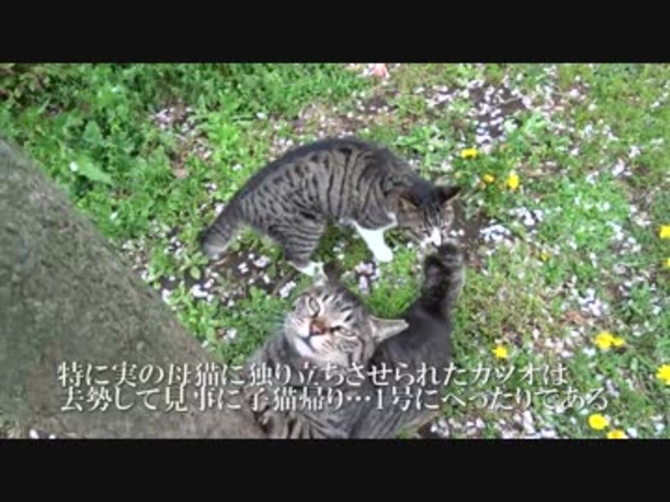 公園で暮らす少年猫のカツオは去勢したら見事に子猫帰りして、公園猫の中でも屈指のフリーダムさを誇るようになってしまいました。<br />相関図 <a href="https://seiga.nicovideo.jp/seiga/im4564643" target="_blank" rel="noopener">im4564643</a><br />ブログ <a href="http://blog.livedoor.jp/nekokamasu/" target="_blank" rel="noopener nofollow">http://blog.livedoor.jp/nekokamasu/</a><br />【2014年当アカウントベスト動画】<a href="https://www.nicovideo.jp/mylist/47649306" target="_blank" rel="noopener">mylist/47649306</a><br />【野良猫観察(2015年)】<a href="https://www.nicovideo.jp/mylist/47649301" target="_blank" rel="noopener">mylist/47649301</a><br />【野良猫観察(2014年)】<a href="https://www.nicovideo.jp/mylist/44575764" target="_blank" rel="noopener">mylist/44575764</a><br />【保護猫の観察】<a href="https://www.nicovideo.jp/mylist/45329168" target="_blank" rel="noopener">mylist/45329168</a><br />【猫の子育て観察】<a href="https://www.nicovideo.jp/mylist/45828555" target="_blank" rel="noopener">mylist/45828555</a><br />【人懐こい野良猫】<a href="https://www.nicovideo.jp/mylist/41859707" target="_blank" rel="noopener">mylist/41859707</a><br />【公園猫戦争】<a href="https://www.nicovideo.jp/mylist/44561791" target="_blank" rel="noopener">mylist/44561791</a><br />【猫のω】<a href="https://www.nicovideo.jp/mylist/44575723" target="_blank" rel="noopener">mylist/44575723</a><br />【キジトラ地獄】<a href="https://www.nicovideo.jp/mylist/44823472" target="_blank" rel="noopener">mylist/44823472</a><br />【野良猫観察(2014年)】<a href="https://www.nicovideo.jp/mylist/44575764" target="_blank" rel="noopener">mylist/44575764</a><br />【野良猫観察(2013年)】<a href="https://www.nicovideo.jp/mylist/37025475" target="_blank" rel="noopener">mylist/37025475</a>