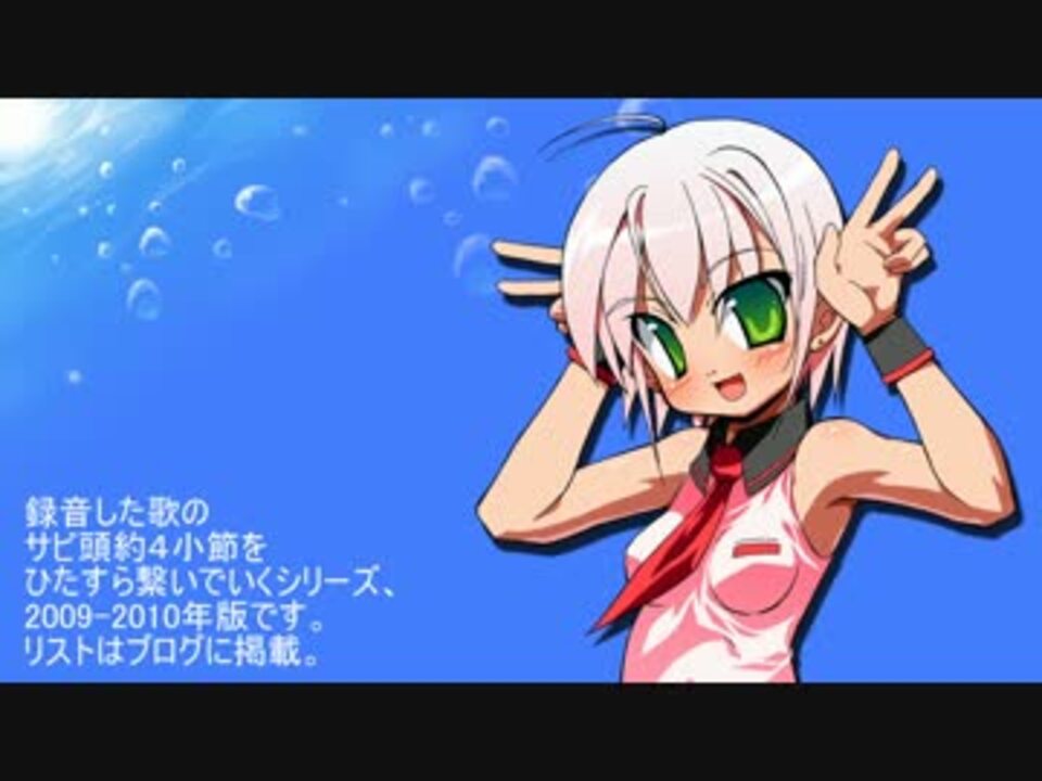 これまでに録音した歌データの、サビ頭約4小節をただひたすら繋いでみたものです。<br>2006~2007年:<a href="https://www.nicovideo.jp/watch/sm26030676" class="watch">sm26030676</a> 2008年:<a href="https://www.nicovideo.jp/watch/sm26034660" class="watch">sm26034660</a><br>ごく一部を除いて、ソロ音源に限定しています。音量の不統一はご了承ください。<br>順番は、ファイルの「更新日時」が古い順になっているので、<strong>大体</strong>録った順です。<br>でも、時々リミックスをかけたりして更新日時が上書きされるので、完全に「録った順」には並んでいません。<br>「公開した順序」は、大スプレッド(<a href="http://bit.ly/1AFd153" target="_blank" rel="noopener nofollow">http://bit.ly/1AFd153</a> )とかブログ(<a href="http://kanipan.diary.to/" target="_blank" rel="noopener nofollow">http://kanipan.diary.to/</a> )を見るとわかると思います。<br>この動画に関する記事は:<a href="http://kanipan.diary.to/archives/52143659.html" target="_blank" rel="noopener nofollow">http://kanipan.diary.to/archives/52143659.html</a><br><br>1767本目の動画<br>blog:<a href="http://kanipan.diary.to/" target="_blank" rel="noopener nofollow">http://kanipan.diary.to/</a><br>twitter:kanipan666 Youtube:<a href="http://www.youtube.com/user/kanipan666" target="_blank" rel="noopener nofollow">http://www.youtube.com/user/kanipan666</a>