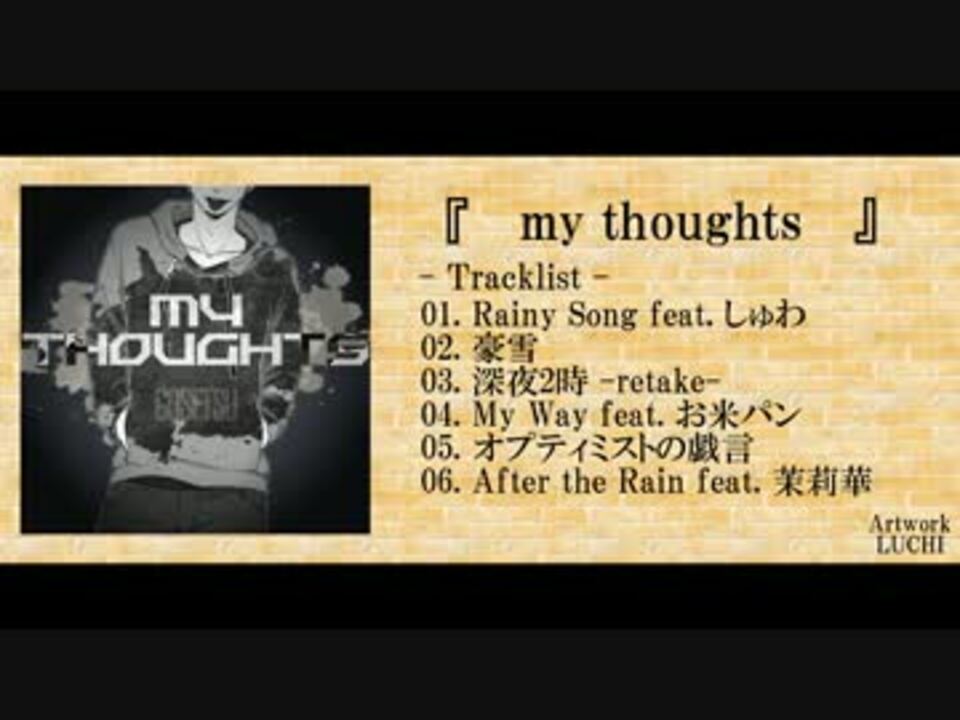 Gosetsuと申します。<br />ここに至るまでに力を貸してくれた皆様に感謝。<br />そして素敵なトラックを投稿し続けているトラックメイカーの皆様へのリスペクトを込めて。<br /><br />Artwork:<br />LUCHI <a href="https://www.nicovideo.jp/mylist/22824305" target="_blank" rel="noopener">mylist/22824305</a><br /><br />Movie:<br />☆イニ☆ <a href="https://www.nicovideo.jp/mylist/27272999" target="_blank" rel="noopener">mylist/27272999</a><br /><br />Guest singer:<br />しゅわ <a href="https://www.nicovideo.jp/mylist/24527594" target="_blank" rel="noopener">mylist/24527594</a><br />お米パン <a href="https://www.nicovideo.jp/mylist/28984919" target="_blank" rel="noopener">mylist/28984919</a><br />茉莉華 <a href="https://www.nicovideo.jp/mylist/27773746" target="_blank" rel="noopener">mylist/27773746</a><br /><br />Rap, Mixing:<br />Gosetsu <a href="https://www.nicovideo.jp/mylist/44407754" target="_blank" rel="noopener">mylist/44407754</a><br /><br />Track(敬称略)<br />Sharty <a href="https://www.nicovideo.jp/watch/nm21809294" class="watch">nm21809294</a><br />Jill <a href="https://www.nicovideo.jp/watch/sm22532599" class="watch">sm22532599</a><br />フダツキ <a href="https://www.nicovideo.jp/watch/sm15542330" class="watch">sm15542330</a><br />sleepwalking <a href="https://www.nicovideo.jp/watch/sm20111503" class="watch">sm20111503</a><br />rabbitman <a href="https://www.nicovideo.jp/watch/sm24089861" class="watch">sm24089861</a><br />T.K.Beatz <a href="https://www.nicovideo.jp/watch/sm22395538" class="watch">sm22395538</a><br /><br />mp3:<br /><a href="http://www1.axfc.net/u/3480195?key=0602" target="_blank" rel="noopener nofollow">http://www1.axfc.net/u/3480195?key=0602</a>