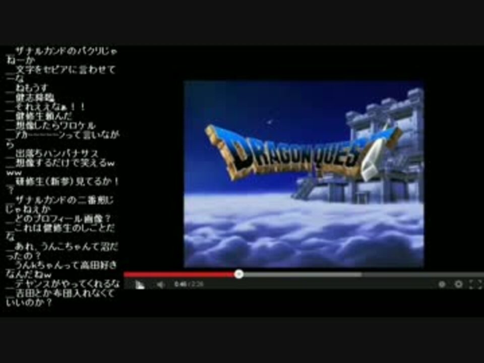 配信開始時間21:53:31 再生時間3:49:00<br /><br />酒を飲みながら実家から配信します。高田健志MAD作ろうとしてたこと、ゴロリが太った優香そっくり<br />包茎コンプ、心臓病、よっち布団もこうに電話、ジャンボと通話、など終始テンション高く雑談します。<br /><br />【話題】ドグマの悪口をいう<a href="#" class="seekTime" data-seekTime="0:00" onclick="seekNicoPlayer('#0:00'); return false;">#0:00</a> 押尾学の名言<a href="#" class="seekTime" data-seekTime="3:00" onclick="seekNicoPlayer('#3:00'); return false;">#3:00</a> ゴロリにツイッチばれた<a href="#" class="seekTime" data-seekTime="3:30" onclick="seekNicoPlayer('#3:30'); return false;">#3:30</a><br /> 実家から放送してる<a href="#" class="seekTime" data-seekTime="4:30" onclick="seekNicoPlayer('#4:30'); return false;">#4:30</a> ドグマにキレてる理由<a href="#" class="seekTime" data-seekTime="6:50" onclick="seekNicoPlayer('#6:50'); return false;">#6:50</a> 高田健志MAD作成を挫折<a href="#" class="seekTime" data-seekTime="12:50" onclick="seekNicoPlayer('#12:50'); return false;">#12:50</a><br /> ドラクエⅣ 生か死か<a href="#" class="seekTime" data-seekTime="19:00" onclick="seekNicoPlayer('#19:00'); return false;">#19:00</a> MAD製作者は全員すごい<a href="#" class="seekTime" data-seekTime="20:20" onclick="seekNicoPlayer('#20:20'); return false;">#20:20</a><br />-----------------<br />1→<a href="https://www.nicovideo.jp/watch/sm26429511" class="watch">sm26429511</a> 2→<a href="https://www.nicovideo.jp/watch/sm26429567" class="watch">sm26429567</a> 3→<a href="https://www.nicovideo.jp/watch/sm26429591" class="watch">sm26429591</a> 4→<a href="https://www.nicovideo.jp/watch/sm26429605" class="watch">sm26429605</a><br />5→<a href="https://www.nicovideo.jp/watch/sm26429644" class="watch">sm26429644</a> 6→<a href="https://www.nicovideo.jp/watch/sm26429682" class="watch">sm26429682</a> 7→<a href="https://www.nicovideo.jp/watch/sm26429745" class="watch">sm26429745</a> 8→<a href="https://www.nicovideo.jp/watch/sm26429770" class="watch">sm26429770</a><br /><br />ドラクエ5 OP <a href="https://www.nicovideo.jp/watch/sm22033368" class="watch">sm22033368</a> <a href="https://www.nicovideo.jp/watch/sm22034569" class="watch">sm22034569</a> ドラクエ4戦闘 <a href="https://www.nicovideo.jp/watch/sm22069751" class="watch">sm22069751</a> クロノ風の憧憬 <a href="https://www.nicovideo.jp/watch/sm22056183" class="watch">sm22056183</a>