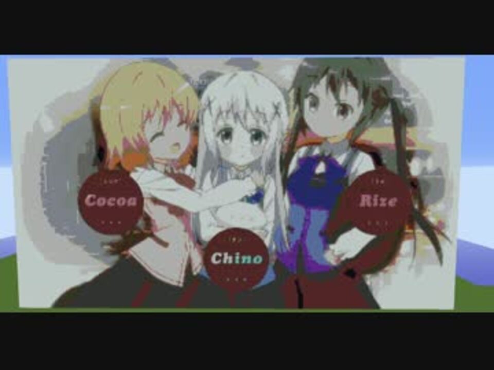 Minecraftでピクセルアートを作り、それを繋げてごちうさOPを再現してみました。<br />この動画は動画をコマ画像に変換するAviUtlの機能と、画像をschematicファイルに変換するマインプランナーの機能と、schematicファイルをワールドに反映させるWorldEditの機能と、描画距離を伸ばすOptiFineの機能と、同じことを約4200回繰り返すうp主の気合のみで制作されています。<br />その他ツール、MOD等は一切使用していません。<br /><br />サイズ: 360×203 (1ブロック1ピクセル)<br />フレームレート: 47/秒<br />使用画像数: 4229枚<br />総撮影画像数: 4271枚 (失敗含む)<br />製作期間: 約1ヶ月<br /><br />高画質YouTube版→ <a href="http://youtu.be/VkftfEI_5_8" target="_blank" rel="noopener nofollow">http://youtu.be/VkftfEI_5_8</a><br /><a href="https://www.nicovideo.jp/watch/sm26045416" class="watch">sm26045416</a> ←前作 次作→ <a href="https://www.nicovideo.jp/watch/sm26941536" class="watch">sm26941536</a><br />実際の撮影画像↓<br /><a href="https://seiga.nicovideo.jp/seiga/im4979985" target="_blank" rel="noopener">im4979985</a> <a href="https://seiga.nicovideo.jp/seiga/im4979986" target="_blank" rel="noopener">im4979986</a>