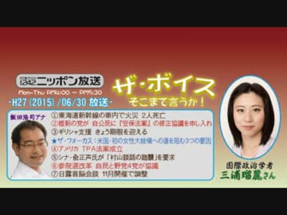 今回は宮崎さんがお休みのため、その代役として招かれたのは、前回の告知どおり飯田泰之さん……ではなくて、まさかの初登場となった国際政治学者の三浦瑠麗(るり)さんでした!<br /><br />三浦さんは、まだ35歳とお若いながらも、テレ朝の『朝生』に出演されるなど注目の女性論客……だそうですが、正直なところ、最近の(アニメを除くw)テレビに疎い私は全く知らなかった御方なので、期待と不安でwktkしながら聴いていたのですが、ここ最近のボイス論客陣とはひと味違う視点や切り口をお持ちだったので、とても興味深いものがありました(^^<br /><br />なんて、あまり書くとまた「先入観が~」と怒られちゃうので(笑)、何はともあれお聴きください!<br />※街ステ飛ばし→ <a href="#" class="seekTime" data-seekTime="38:00" onclick="seekNicoPlayer('#38:00'); return false;">#38:00</a><br />□<a href="https://www.nicovideo.jp/mylist/50437895" target="_blank" rel="noopener">mylist/50437895</a>□<a href="https://www.nicovideo.jp/mylist/36340069" target="_blank" rel="noopener">mylist/36340069</a>□<a href="https://www.nicovideo.jp/mylist/41644857" target="_blank" rel="noopener">mylist/41644857</a>