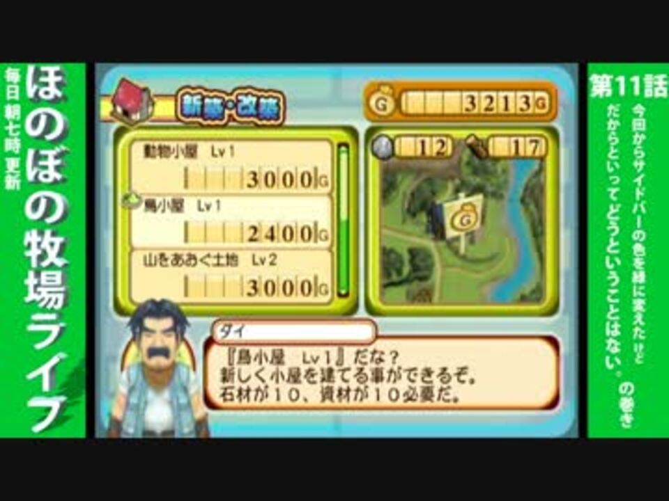 毎日朝七時更新 ほのぼの牧場ライフ 第11話<br />「今回からサイドバーの色を緑に変えたけど<br />だからといってどうということはない」の巻き<br /><br />ついに鳥小屋が買えた!!<br />そしてメープル湖地区、最大の謎!巨大魚影の正体が今解き明かされる!<br /><br /><a href="https://www.nicovideo.jp/watch/sm26646162" class="watch">sm26646162</a>←第10話 第12話→<a href="https://www.nicovideo.jp/watch/sm26646277" class="watch">sm26646277</a> 朝7時投稿<br />シリーズマイリスト(<a href="https://www.nicovideo.jp/mylist/50719564" target="_blank" rel="noopener">mylist/50719564</a>)<br /><br />その他のわいわい動画(<a href="https://www.nicovideo.jp/mylist/12317813" target="_blank" rel="noopener">mylist/12317813</a>)<br /><br />ブログ:<a href="http://waiwaidadasuberi.blog47.fc2.com/" target="_blank" rel="noopener nofollow">http://waiwaidadasuberi.blog47.fc2.com/</a><br />Twitter:<a href="https://twitter.com/ABCDYY" target="_blank" rel="noopener nofollow">https://twitter.com/ABCDYY</a>