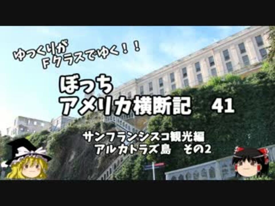 アルカトラズ島に潜入しました!<br />ネタは途中で恥ずかしくなって止めてしまった・・・<br /><br /><br />twitter=<a href="https://twitter.com/ryontan" target="_blank" rel="noopener nofollow">https://twitter.com/ryontan</a><br /><br />1日目・・・出発編<br />2日目・・・往路 ファーストクラス編<br /> シカゴ観光編<br />3~5日目・・・アムトラック編<br />6日目・・・サンフランシスコ観光編<font color="red">←今ココ</font><br />7日目・・・帰路 ビジネスクラス編<br />旅ブログ→<a href="http://ryotaroo.blog.fc2.com/" target="_blank" rel="noopener nofollow">http://ryotaroo.blog.fc2.com/</a><br /><br /><br /><a href="https://www.nicovideo.jp/watch/sm26634273" class="watch">sm26634273</a>←前回 <font color="red">次回 第42話→<a href="https://www.nicovideo.jp/watch/sm26680381" class="watch">sm26680381</a></font><br />今作 アメリカ横断記→<a href="https://www.nicovideo.jp/mylist/48621785" target="_blank" rel="noopener">mylist/48621785</a><br />前作 イタリア周遊記→<a href="https://www.nicovideo.jp/mylist/45763559" target="_blank" rel="noopener">mylist/45763559</a><br />前々作 NY旅行記→<a href="https://www.nicovideo.jp/mylist/44343854" target="_blank" rel="noopener">mylist/44343854</a>