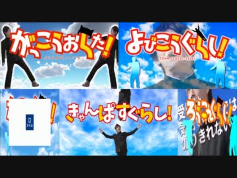 左上:がっこうおちた!(<a href="https://www.nicovideo.jp/watch/sm26676476" class="watch">sm26676476</a>) めがっちさん<br>右上:よびこうぐらし!(<a href="https://www.nicovideo.jp/watch/sm26679206" class="watch">sm26679206</a>) 伯方さん<br>下中央:きゃんぱすぐらし!(<a href="https://www.nicovideo.jp/watch/sm26696707" class="watch">sm26696707</a>) 絶望さん<br>右下:ろうにんぐらし!(<a href="https://www.youtube.com/watch?v=GUklM4UouaM)" target="_blank" rel="noopener nofollow">https://www.youtube.com/watch?v=GUklM4UouaM)</a> watagashi533さん<br>左下べんきょうぐらし.mp4(<a href="https://www.nicovideo.jp/watch/sm26689691" class="watch">sm26689691</a>) ドラちゃんさん