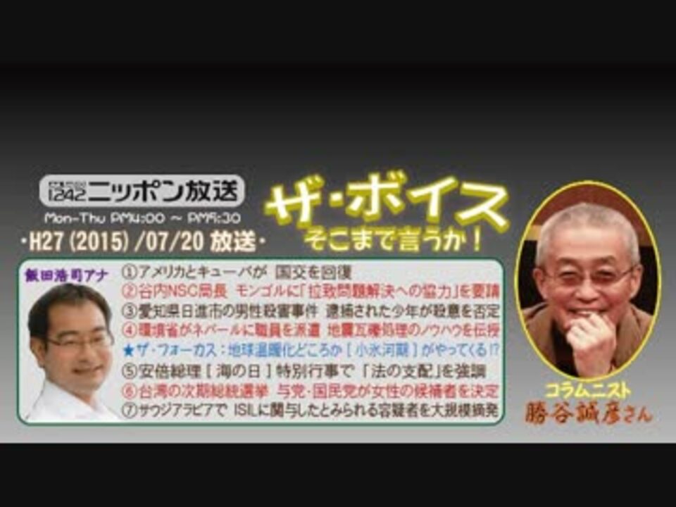 こちらの勝谷さんに限りませんが、地方のリスナーさんからのメールが届くと、よく「え、そんな地域でも聴けてるの!?」~と驚かれるMCに対し、その都度「今はラジコプレミアムがありますから」~とフォローを入れる飯田アナという図式は、もはやお約束といった感じですね(笑)<br /><br />そのラジコといえば、私、今回の旅行は伊豆に行ってたんですが、ふとあちらでラジコを立ち上げてみたら「ニッポン放送」が表示されないことに、軽いカルチャーショックに見舞われまして……。改めて「タダで聴ける関東圏に住んでいて良かった!」と思ったのでした(^^;<br /><br />あと、静岡って、アニメも不毛地帯なんですよね……、1週間も居たら発狂しそう(こら<br />※街ステ飛ばし→ <a href="#" class="seekTime" data-seekTime="37:50" onclick="seekNicoPlayer('#37:50'); return false;">#37:50</a><br />□<a href="https://www.nicovideo.jp/mylist/50437895" target="_blank" rel="noopener">mylist/50437895</a>□<a href="https://www.nicovideo.jp/mylist/36340069" target="_blank" rel="noopener">mylist/36340069</a>□<a href="https://www.nicovideo.jp/mylist/41644857" target="_blank" rel="noopener">mylist/41644857</a>