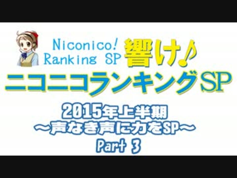 ■集計期間:2014年12月26日5時~2015年7月1日5時<br />■集計方法:再生数+コメント数×補正値+マイリスト登録数×20<br />■集計対象:週刊ニコニコランキング150位以内に一度でも入った作品など<br />※詳しくはPart1の最初を確認してください<br />──────<br />■Part1:<a href="https://www.nicovideo.jp/watch/sm26750375" class="watch">sm26750375</a><br />■Part2:<a href="https://www.nicovideo.jp/watch/sm26751075" class="watch">sm26751075</a><br />──────<br />■プレイリスト:公開終了<br />■結果置き場:<a href="http://nicoranweb.com/ranking/special/17" target="_blank" rel="noopener nofollow">http://nicoranweb.com/ranking/special/17</a><br />──────<br />SP16:<a href="https://www.nicovideo.jp/watch/sm25221987" class="watch">sm25221987</a> | SP18:<a href="https://www.nicovideo.jp/watch/sm27906458" class="watch">sm27906458</a><br />──────<br />もっとニコニコランキングを観たい人は<br />こちらのTwitterをフォローしてください!毎週月曜に更新しています。<br /><b><font color="#ff0000"><font size="4"><a href="https://twitter.com/nico_ran" target="_blank" rel="noopener nofollow">https://twitter.com/nico_ran</a> @nico_ran</font></font></b><br /><br />声なきニコ厨に力を。愛なきニコ動に愛を。