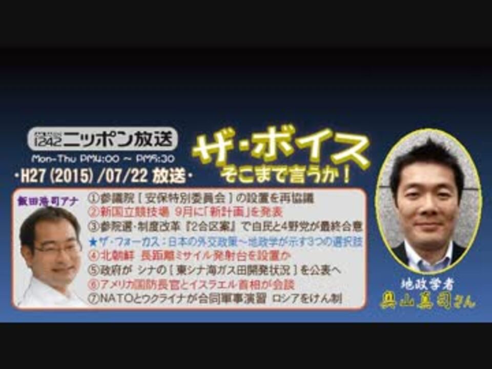 今回は久々の奥山さん~って、前回が去年の11月と、実に9ヶ月ぶりだったんですねぇ。いやはや、月日が経t(ry<br />1本目の、これから参議院で始まる安保法案の議論について、野党側に「事の本質は"対中問題"だと、政府与党側が言えない事情を鑑みて、助け船的にズバッと言って欲しい(意訳」~などと、ある種の"理想論"を語られたので驚いたのですが、すぐさま「ただ野党の方も、中国に阿らなきゃいけないというか"支援を受けている"部分もあるので……」とリアリズムな実情をさらりとバラしちゃったので、めっちゃウケましたw<br />賢い方は、皮肉の利かせ方もクールですねぇ(^^<br /><br />なお、<b>明日は、安倍総理が緊急生出演だそうです!!</b><br />※街ステ飛ばし→ <a href="#" class="seekTime" data-seekTime="36:05" onclick="seekNicoPlayer('#36:05'); return false;">#36:05</a><br />□<a href="https://www.nicovideo.jp/mylist/50437895" target="_blank" rel="noopener">mylist/50437895</a>□<a href="https://www.nicovideo.jp/mylist/36340069" target="_blank" rel="noopener">mylist/36340069</a>□<a href="https://www.nicovideo.jp/mylist/41644857" target="_blank" rel="noopener">mylist/41644857</a>