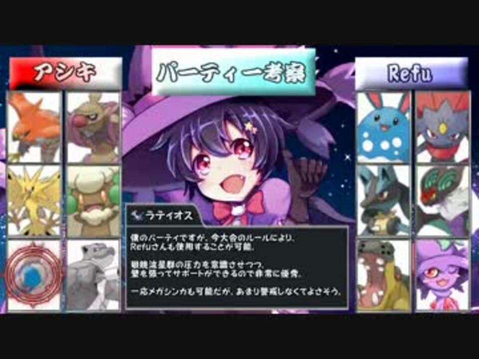 みなさんはじめまして。アシキです。<br />ドラフト甲子園一回戦、アシキvsRefuのアシキ視点になります。<br />次→<a href="https://www.nicovideo.jp/watch/sm26857860" class="watch">sm26857860</a><br />Refuさん視点→<a href="https://www.nicovideo.jp/watch/sm26778526" class="watch">sm26778526</a><br /><br /><b>【目次】</b><br />①前語り(自己紹介、対戦相手紹介、???) ~<font color=#ff0000><a href="#" class="seekTime" data-seekTime="9:41" onclick="seekNicoPlayer('#9:41'); return false;">#9:41</a></font><br />②パーティ考察 <font color=#ff0000><a href="#" class="seekTime" data-seekTime="9:41" onclick="seekNicoPlayer('#9:41'); return false;">#9:41</a></font>~<font color=#ff0000><a href="#" class="seekTime" data-seekTime="22:08" onclick="seekNicoPlayer('#22:08'); return false;">#22:08</a></font><br />③対戦開始 <font color=#ff0000><a href="#" class="seekTime" data-seekTime="23:25" onclick="seekNicoPlayer('#23:25'); return false;">#23:25</a></font>~#??:??(動画内では24:30~と表記してありますが、そちらがミスです)<br />④あとがたり #??:??~<br /><font color=#ff0000><b>※対戦に関係ない前語りが非常に長いので、上記目次横(#~~:~~)をクリックして、<br /> お好みで飛ばしながらご視聴ください</b></font><br /><br />コメント返し→<a href="https://ch.nicovideo.jp/article/ar830307" target="_blank" rel="noopener">ar830307</a><br />マイリスト→<a href="https://www.nicovideo.jp/mylist/45800343" target="_blank" rel="noopener">mylist/45800343</a><br />連絡先Twitter:@pokemon_ashiki<br /><br />