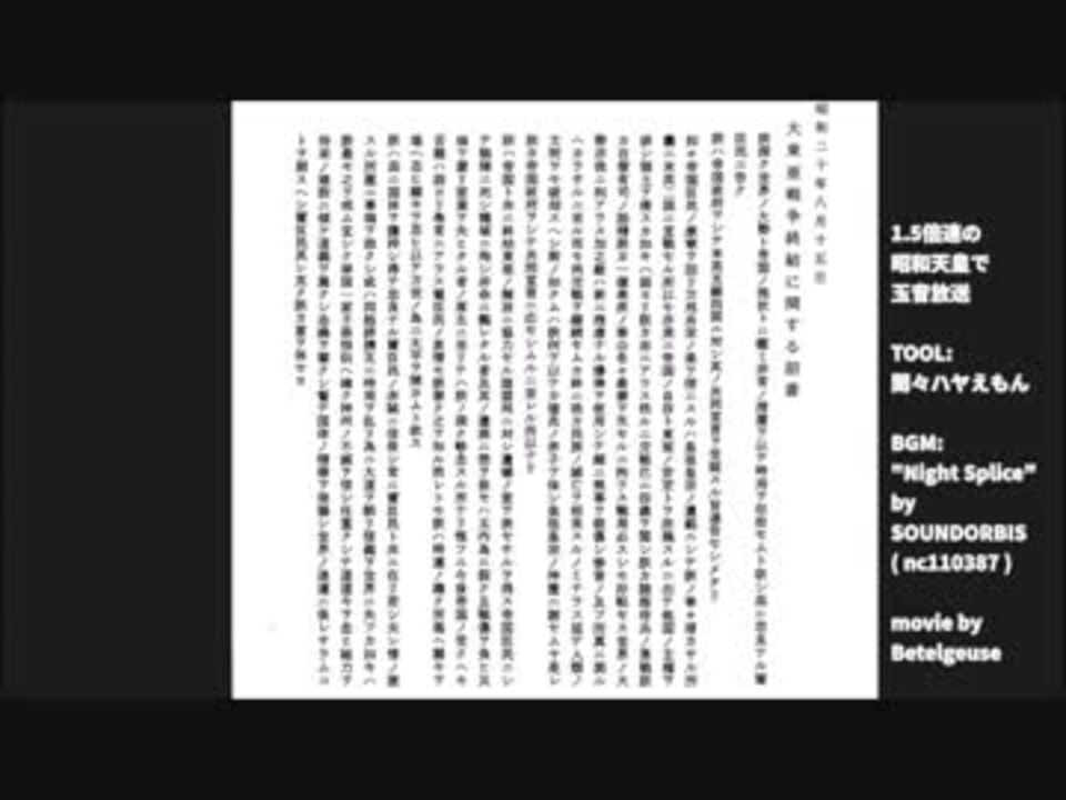 <a href="http://youtu.be/vt8NXL6Qdq4" target="_blank" rel="noopener nofollow">http://youtu.be/vt8NXL6Qdq4</a><br />音MADをやる技量は無いので、昭和天皇を加速してテンポよく聴けるようにしてみました。<br />BGM: <a href="https://commons.nicovideo.jp/works/nc110387" target="_blank" rel="noopener">nc110387</a><br />