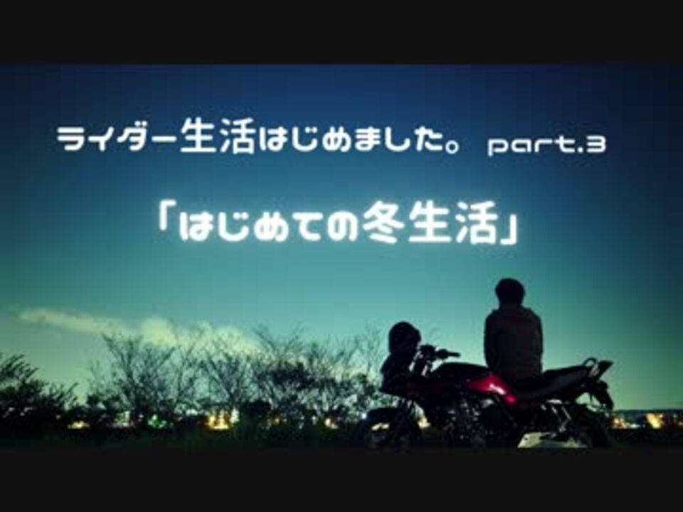 <b>「はじめての冬生活」</b><br /><br />ご無沙汰しております。<br />暑い夏が始まりましたね。<br /><br />今回は以前にも増して車載成分少なめとなっております。<br />寒い冬の映像だから仕方ないですよね。<br />ごめんなさい次からはがんばります。イエー<br /><br />撮影機材<br />SONY HDR-AS100V<br />RICOH GR DIGITAL Ⅳ<br /><br />Part.2→<a href="https://www.nicovideo.jp/watch/sm25963807" class="watch">sm25963807</a><br />Part.4→<a href="https://www.nicovideo.jp/watch/sm27487678" class="watch">sm27487678</a><br /><br />ライダー生活はじめました。→<a href="https://www.nicovideo.jp/mylist/47827191" target="_blank" rel="noopener">mylist/47827191</a><br /><br />Twitter生活はじめました。<br /><a href="https://twitter.com/hajimeegg" target="_blank" rel="noopener nofollow">https://twitter.com/hajimeegg</a><br />頑張って生きています。<br /><br />【追記:宣伝晒し感謝です!】<br />ルイス式さん・zipさん・紅坂ユウさん・くれすたんさん・与一さん・狐の大佐さん・Friendsさん・ラーメン王さん・<b>律α</b>さん