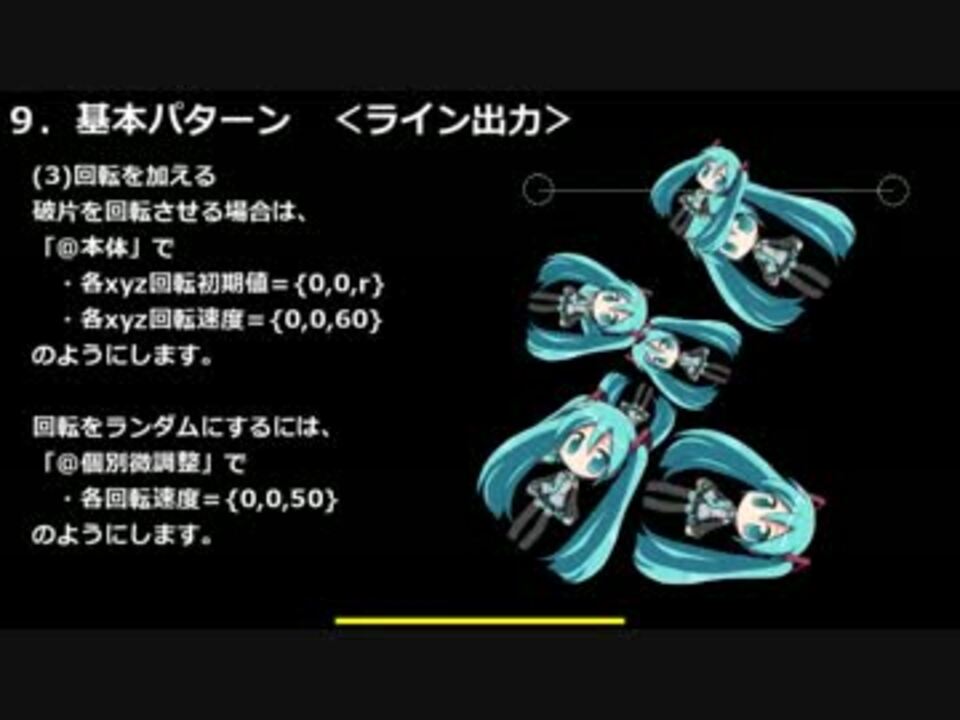 rikky氏の公開されているスクリプト「拡張パーティクル(R)」の、入門的なごく一部の解説です。<br /><br />拡張パーティクル(R)配布動画 → <a href="https://www.nicovideo.jp/watch/sm26128322" class="watch">sm26128322</a><br />ブロマガ(使い方まとめ) → <a href="https://ch.nicovideo.jp/article/ar715342" target="_blank" rel="noopener">ar715342</a><br /><br /><a href="#" class="seekTime" data-seekTime="0:05" onclick="seekNicoPlayer('#0:05'); return false;">#0:05</a> 構成<br /><a href="#" class="seekTime" data-seekTime="0:15" onclick="seekNicoPlayer('#0:15'); return false;">#0:15</a> @パーティクル本体<br /><a href="#" class="seekTime" data-seekTime="1:30" onclick="seekNicoPlayer('#1:30'); return false;">#1:30</a> @個別微調整<br /><a href="#" class="seekTime" data-seekTime="1:50" onclick="seekNicoPlayer('#1:50'); return false;">#1:50</a> @出力<br /><a href="#" class="seekTime" data-seekTime="2:35" onclick="seekNicoPlayer('#2:35'); return false;">#2:35</a> @方向と格子<br /><a href="#" class="seekTime" data-seekTime="2:45" onclick="seekNicoPlayer('#2:45'); return false;">#2:45</a> @フィルター(単色化専用)<br /><a href="#" class="seekTime" data-seekTime="3:11" onclick="seekNicoPlayer('#3:11'); return false;">#3:11</a> @画像<br /><a href="#" class="seekTime" data-seekTime="3:26" onclick="seekNicoPlayer('#3:26'); return false;">#3:26</a> @拡大率と透過率<br /><a href="#" class="seekTime" data-seekTime="3:44" onclick="seekNicoPlayer('#3:44'); return false;">#3:44</a> 基本パターン