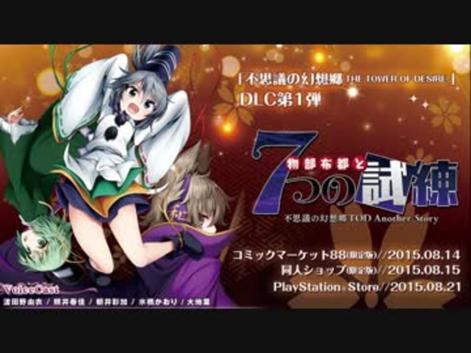 PS Vita専用ソフト『不思議の幻想郷-THE TOWER OF DESIRE-』DLC第一弾<br /> 『物部布都と7つの試練』<br /> 東方Project二次創作 / ダンジョン探索型RPG<br /> 2015年8月14日コミックマーケット88で限定版、先行発売決定!<br /> PS Storeでは8月21日より配信開始予定です。<br /> <a href="http://www.aquastyle.org/fusgigen_tod/special.html" target="_blank" rel="noopener nofollow">http://www.aquastyle.org/fusgigen_tod/special.html</a><br /> <br />不思議の幻想郷TODに第1弾DLCが登場!<br />物語はふし幻TODの前日譚で神子から課せられた、<br />「7つの試練」に布都と屠自古が挑む外伝ストーリー。<br />TODの本編にも「物部布都」がプレイヤーとして参戦、<br />そして「蘇我屠自古」がパートナーとして追加がされます。<br />追加要素多数の大ボリュームDLCで、まだまだその不思議を探して楽しもう!<br /><br />ふし幻TODティザーPV <a href="https://www.nicovideo.jp/watch/sm26161082" class="watch">sm26161082</a><br />