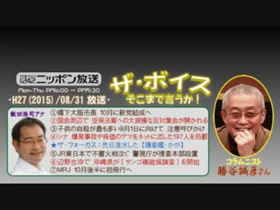 冒頭で、改めて「鬱病からの完全復活」を宣言された勝谷さんですが、その中で、「鬱病は、いわゆる"文明病"だね」という話がありましたが、それに関しては、自殺もその側面がありますよね。<br />まぁ、全ては、「人の欲望には限りが無い」ということなんだと思います。生きるだけなら「食う・出す・寝る」だけやってりゃいいけど"飽きる"ので、より美味しく・快適・便利に~となっていくから、結果、格差の拡大・劣等感・悩み・諍いの連鎖に……(^^;<br /><br />だから、何事も"性善説"で考えちゃダメなんですよね。安保問題だってそうです。そりゃ対話だけで争いを回避できれば世話ないですが、安保反対デモ参加者の"好戦的"な素振りが……ねぇ?w<br />※街ステ飛ばし→ <a href="#" class="seekTime" data-seekTime="39:40" onclick="seekNicoPlayer('#39:40'); return false;">#39:40</a><br />□<a href="https://www.nicovideo.jp/mylist/50437895" target="_blank" rel="noopener">mylist/50437895</a>□<a href="https://www.nicovideo.jp/mylist/36340069" target="_blank" rel="noopener">mylist/36340069</a>□<a href="https://www.nicovideo.jp/mylist/41644857" target="_blank" rel="noopener">mylist/41644857</a>