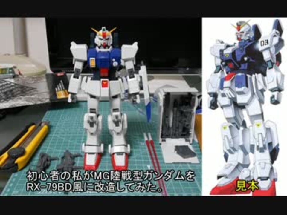 ガンプラ初心者が写真だけを頼りにRX-79[G]をRX-79[BD]に改造してみた。<br />初めてパテ等を使ったみたのですが思ったよりも時間がかかりますね。<br />塗装前まで進めたのでご意見やアドヴァイスを頂けたら幸いです。<br /><br />※追記1<br />多くの方々からアドヴァイスを頂いて感謝しております。<br />少しずつ作業を進めて行ってますので時間が空きますが、<br />完成した際また動画を上げたいと思います。<br /><br />※追記2<br />取り敢えず安価なエアブラシとサーフェイサー買いました。<br /><br />※追記3<br />進展があった場合はtwitterでつぶやいていこうと思います。<br />twitter <a href="https://twitter.com/eumenes_car" target="_blank" rel="noopener nofollow">https://twitter.com/eumenes_car</a><br />※追記4<br />1万再生とか皆様本当にありがとうございます。<br /><br />次回 <a href="https://www.nicovideo.jp/watch/sm27257615" class="watch">sm27257615</a>次回作 <a href="https://www.nicovideo.jp/watch/sm29101028" class="watch">sm29101028</a>