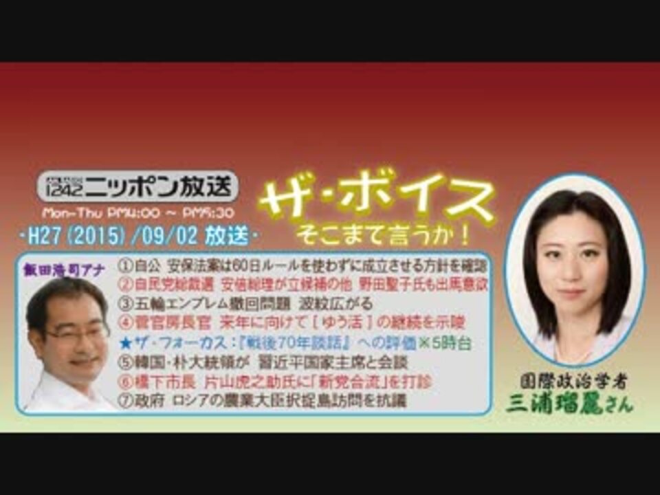 前回初登場の際に、「ここ最近のボイス論客陣とはひと味違う視点や切り口をお持ちで興味深かった」という感想を抱いた三浦さんですが、この2回目の論調を聞いて、尚更その思いを強くしました。<br />彼女の場合、右だ左だ的な立場ありきではなく、努めて客観的かつ現実的に物事を捉えて分析していこうという姿勢なんでしょうね。要はリアリストで、そのおかげで色んな方面から重宝されたり批判されたりもすると。<br /><br />だからこそ、ともすれば「極右」だの「安倍政権のヨイショ番組だ」などとアホなレッテルを貼られがちな当番組には、ありがたい論客だと思います。2回目まではバーターっぽいので、ぜひ今後も準レギュラー的でよしなに(^^<br />※街ステ飛ばし→ <a href="#" class="seekTime" data-seekTime="39:47" onclick="seekNicoPlayer('#39:47'); return false;">#39:47</a><br />□<a href="https://www.nicovideo.jp/mylist/50437895" target="_blank" rel="noopener">mylist/50437895</a>□<a href="https://www.nicovideo.jp/mylist/36340069" target="_blank" rel="noopener">mylist/36340069</a>□<a href="https://www.nicovideo.jp/mylist/41644857" target="_blank" rel="noopener">mylist/41644857</a>