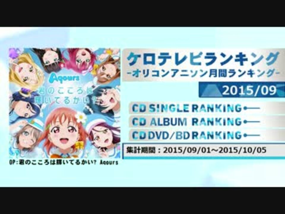 [HP]<a href="http://www20.atwiki.jp/keroro00innovator/" target="_blank" rel="noopener nofollow">http://www20.atwiki.jp/keroro00innovator/</a><br />デイリー:<a href="http://www20.atwiki.jp/keroro00innovator/pages/25.html" target="_blank" rel="noopener nofollow">http://www20.atwiki.jp/keroro00innovator/pages/25.html</a><br />週間:<a href="http://www20.atwiki.jp/keroro00innovator/pages/26.html" target="_blank" rel="noopener nofollow">http://www20.atwiki.jp/keroro00innovator/pages/26.html</a><br />2015年9月度のランキングです。<br />基本的にアニメソングのみ。除外基準:<a href="http://www20.atwiki.jp/keroro00innovator/pages/4.html" target="_blank" rel="noopener nofollow">http://www20.atwiki.jp/keroro00innovator/pages/4.html</a><br />8月:<a href="https://www.nicovideo.jp/watch/sm27064895" class="watch">sm27064895</a> 10月:<a href="https://www.nicovideo.jp/watch/sm27512224" class="watch">sm27512224</a> ランキング一覧:<a href="https://www.nicovideo.jp/mylist/47656494" target="_blank" rel="noopener">mylist/47656494</a>