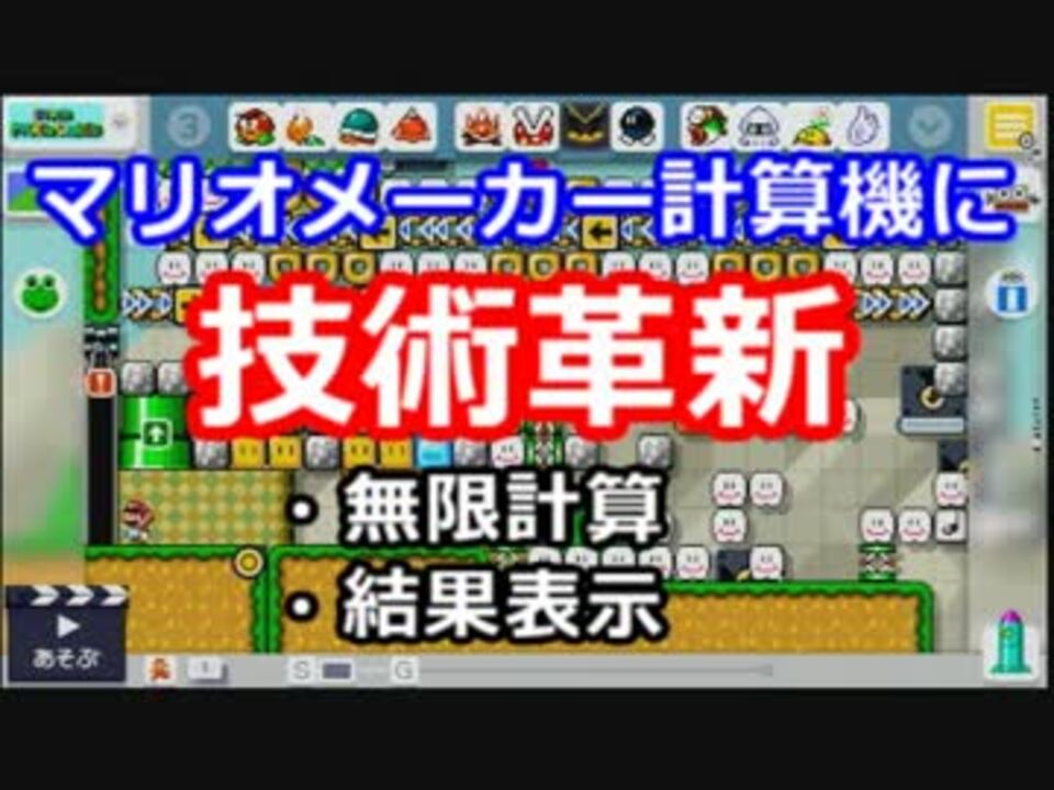 ID:6F78-0000-00AB-2CE6<br /><br />技術革新により前回の32bit計算機(<a href="https://www.nicovideo.jp/watch/sm27351491" class="watch">sm27351491</a>)の課題であった<b><font color="red">「何度でも使える回路」</font></b>の実用化に成功しました。<br />理論上は<b>無限の桁数を計算可能な回路</b>を使い、34桁+34桁の2進数の足し算を計算し、その出力結果を2進数で表示できます。<br />(コースのクリアも可能です)<br />(追記)<br />・折り返しでPスイッチが黒パックンに踏まれる不具合がありました。片方をPOMにすることで回避できます。<br /><br /><b>64bitに拡張しました</b>→<a href="https://www.nicovideo.jp/watch/sm27426801" class="watch">sm27426801</a><br /><br />参考資料<br /><a href="https://www.nicovideo.jp/watch/sm27335792" class="watch">sm27335792</a>:こちらで使われていたギミックを使用しました。<br /><a href="https://www.nicovideo.jp/watch/sm27400376" class="watch">sm27400376</a>:新技術で表示を45bitに更新されました。<br /><br />マリオメーカー学会発表まとめ:<a href="https://www.nicovideo.jp/mylist/53472912" target="_blank" rel="noopener">mylist/53472912</a>