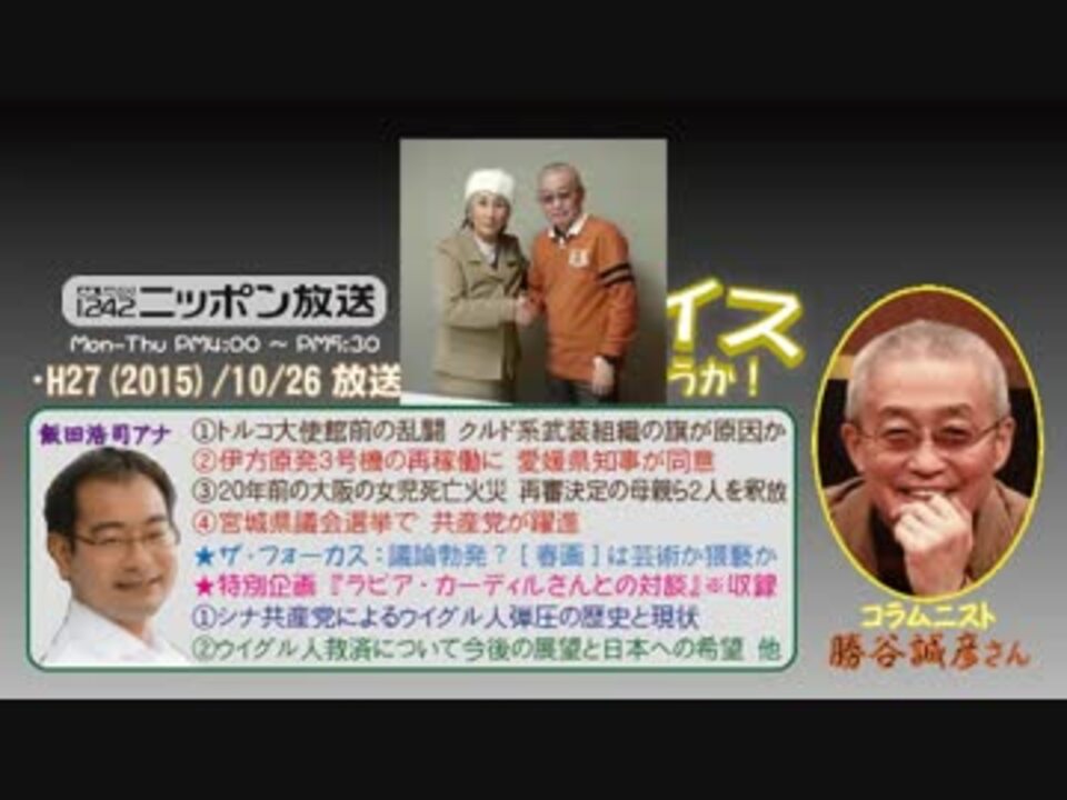 今回は、先週の特別企画のプチ延長戦といった感じで、いつものニュース解説は前半のみとし、後半では、来日された世界ウイグル会議総裁のラビア・カーディルさんとの対談の模様が流されたのですが、此処のヘビーリスナーにとっては復習的なものばかりで、特に真新しい話が聞けなかったのは、正直物足りないかも?(^^;<br />でも、当事者からの生の声を伝えることや、たまたま聴いてくれたライト層の方々にも周知するという面においては、とても意義あるものだったと思います(^^<br /><br />しかし、「力が強いか正義が強いか、これから私たちが示します」だなんて、勝谷さんらしくない甘ちゃん発言ですねぇ……、そう、力あってこその正義ですよw<br />※街ステ飛ばし→ <a href="#" class="seekTime" data-seekTime="39:01" onclick="seekNicoPlayer('#39:01'); return false;">#39:01</a><br />□<a href="https://www.nicovideo.jp/mylist/50437895" target="_blank" rel="noopener">mylist/50437895</a>□<a href="https://www.nicovideo.jp/mylist/36340069" target="_blank" rel="noopener">mylist/36340069</a>□<a href="https://www.nicovideo.jp/mylist/41644857" target="_blank" rel="noopener">mylist/41644857</a>