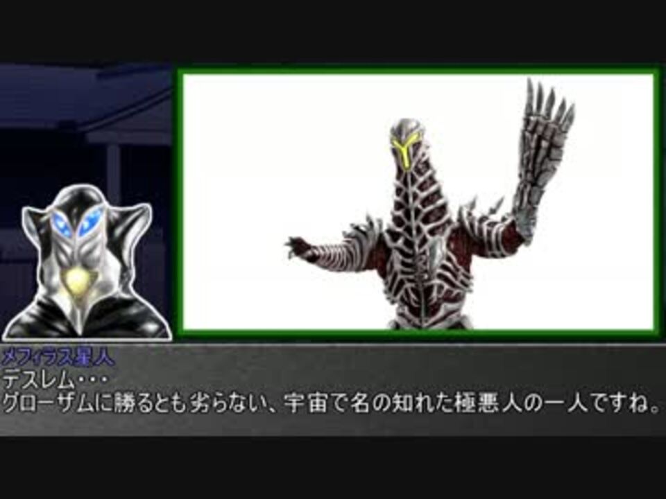 ※立川市は東京都にあります。あとデスレムは55mです。間違いが多くすみません・・・<br /><br />今回はウルトラマンメビウスより「策謀宇宙人デスレム」をご紹介。<br />炎上のデスローグなど、同族の「デスレ星雲人」にも触れています。<br />こんなに描き辛いキャラクターも結構限られているのではないかと・・・<br /><br /><a href="https://www.nicovideo.jp/watch/sm27253914" class="watch">sm27253914</a>←前 次→<a href="https://www.nicovideo.jp/watch/sm27652247" class="watch">sm27652247</a><br />マイリスト→<a href="https://www.nicovideo.jp/mylist/36883720" target="_blank" rel="noopener">mylist/36883720</a> 動画用イラスト→<a href="https://seiga.nicovideo.jp/clip/880468" target="_blank" rel="noopener">clip/880468</a><br /><br />◆その他企画◆<br />ゆっくり霊夢とやる夫が学ぶ ウルトラ怪獣大百科(SS版)→<a href="https://ch.nicovideo.jp/article/ar214243" target="_blank" rel="noopener">ar214243</a><br />昆虫やゴジラなど他のシリーズは、このマイリスからどうぞ→<a href="https://www.nicovideo.jp/mylist/39889181" target="_blank" rel="noopener">mylist/39889181</a><br />生放送とかをやっている怪獣コミュニティ→co1805608