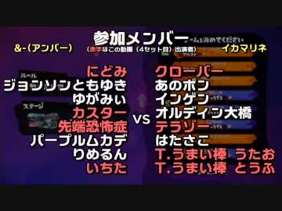 連携しないチャージャー勢のテラゾーです。3セット目と4セット目の計8試合に参加しました<br /><br />企画詳細:<a href="https://ch.nicovideo.jp/article/ar898001" target="_blank" rel="noopener">ar898001</a> 他視点:<a href="https://www.nicovideo.jp/mylist/53737418" target="_blank" rel="noopener">mylist/53737418</a> 4セット目:13日17時⇒<a href="https://www.nicovideo.jp/watch/sm27557341" class="watch">sm27557341</a><br /><br /><b>参加メンバー</b>(太字は3セット目参加者)<br />&-(アンバー):<b>にどみ</b> ジョンソンともゆき ゆがみぃ <b>カスター</b> <b>先端恐怖症</b> パープルムカデ りめるん <b>いちた</b><br />イカマリネ:<b>クローバー</b> あのポン インゲン オルディン大橋 <b>テラゾー</b> はたさこ <b>T.うまい棒うたお・とうふ</b><br /><br /><b>■その他の実況(オススメ度付き):<a href="https://www.nicovideo.jp/mylist/16239260" target="_blank" rel="noopener">mylist/16239260</a><br />■twitter(出演・更新情報他)⇒<a href="http://twitter.com/terazo" target="_blank" rel="noopener nofollow">http://twitter.com/terazo</a></font></b>