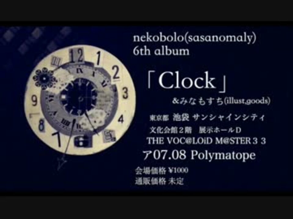 VOCALIOID 6th Album「Clock」<br />THE VOC@LOiD M@STER33<br />ア07.08「Polymatope」で頒布いたします。<br />全12曲. 会場価格:¥1000<br />通販開始してます。<a href="http://bit.ly/1He54d3" target="_blank" rel="noopener nofollow">http://bit.ly/1He54d3</a><br /><br />Fractalも出します。<a href="https://www.nicovideo.jp/watch/sm27567822" class="watch">sm27567822</a><br />ササノマリイ名義のCDも持っていきます。<br /><br />ジャケットデザイン:すち<br />ひさしぶり なにとぞ。<br />イラストとグッズなども。<br /><br />:://Twitter//::<br />ねこぼーろ(ササノマリイ)::@nekobolo<br />みなもすち::@suti_onnpunyamo <br /><br /><br />:://mylist&pixiv//:: <br />ねこぼーろ:::<a href="https://www.nicovideo.jp/mylist/13459994" target="_blank" rel="noopener">mylist/13459994</a> <br />すち:::<a href="http://www.pixiv.net/member.php?id=2202497" target="_blank" rel="noopener nofollow">http://www.pixiv.net/member.php?id=2202497</a><br />