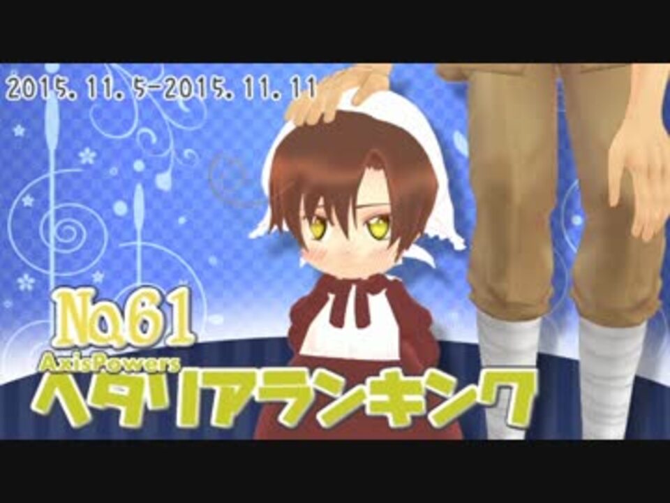 ◆11月5日~11月11日に投稿された動画を対象としたランキングです。<br />◇タグに「AxisPowersヘタリア」が登録されている動画が対象です。<br />◆AxisPowersヘタリアランキング <a href="https://www.nicovideo.jp/mylist/45818119" target="_blank" rel="noopener">mylist/45818119</a><br />◇ランキング紹介動画 ブロマガ→ <a href="https://ch.nicovideo.jp/article/ar911012" target="_blank" rel="noopener">ar911012</a> <br />◆ヒストリー紹介動画 <a href="https://www.nicovideo.jp/mylist/45789681" target="_blank" rel="noopener">mylist/45789681</a><br />◇前→ <a href="https://www.nicovideo.jp/watch/sm27536527" class="watch">sm27536527</a> 次→ <a href="https://www.nicovideo.jp/watch/sm27634533" class="watch">sm27634533</a> <br />◆動画内で使用したイラスト → id=53452543 id=53550537(Pixiv) <a href="https://seiga.nicovideo.jp/seiga/im5337077" target="_blank" rel="noopener">im5337077</a> <a href="https://seiga.nicovideo.jp/seiga/im5352494" target="_blank" rel="noopener">im5352494</a><br />◇OP・ED使用曲 → <a href="https://www.nicovideo.jp/mylist/49568154" target="_blank" rel="noopener">mylist/49568154</a><br />◆イラスト募集について → <a href="https://ch.nicovideo.jp/article/ar635923" target="_blank" rel="noopener">ar635923</a><br /><br />※転載&スクショ禁止 / 禁止转载&禁止截图 / Do Not Re-upload. Do not screenshot & screen capture.
