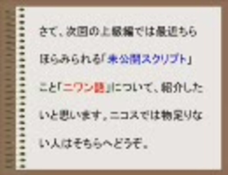 中級編。うp主向け説明動画。そこそこ使えるようになったうp主向け。あいかわらず切り替わりが速いので一時停止は必須。上級編できました→<a href="https://www.nicovideo.jp/watch/sm4934083" class="watch">sm4934083</a>。動画講座初級<a href="https://www.nicovideo.jp/watch/sm2378567" class="watch">sm2378567</a>、数字あてゲーム<a href="https://www.nicovideo.jp/watch/sm2406853" class="watch">sm2406853</a>、色彩感覚ゲーム<a href="https://www.nicovideo.jp/watch/sm2655712" class="watch">sm2655712</a>、棒けしゲーム<a href="https://www.nicovideo.jp/watch/sm2842969" class="watch">sm2842969</a>。コピペ用スクリプト素材集<a href="https://www.nicovideo.jp/mylist/6027274" target="_blank" rel="noopener">mylist/6027274</a>。その他うpリスト<a href="https://www.nicovideo.jp/mylist/3871495" target="_blank" rel="noopener">mylist/3871495</a>