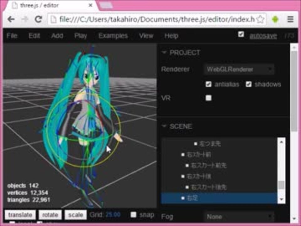 現状は「MMDデータを扱えるようにした」がより正確かも。<br /><br />前: <a href="https://www.nicovideo.jp/watch/sm26268613" class="watch">sm26268613</a> 次: <a href="https://www.nicovideo.jp/watch/sm27956156" class="watch">sm27956156</a><br /><a href="https://www.nicovideo.jp/mylist/49125767" target="_blank" rel="noopener">mylist/49125767</a><br /><br />デモ: <a href="http://threejs.org/examples/#webgl_loader_mmd_audio" target="_blank" rel="noopener nofollow">http://threejs.org/examples/#webgl_loader_mmd_audio</a><br /><br />JavaScriptでMMDデータを扱えるMMDLoaderを作りました。<br />Three.js r74に入りました。<br />ブラウザ上でリアルタイムにMMDを踊らせたり、その他色々できます。<br /><br />後半はまだまだ開発途中のブラウザMMDエディタの紹介。<br />Three.js EditorにMMDをサポートさせようとしているところ。<br />エディタデモ: <a href="http://takahirox.github.io/three.js.mmdeditor/editor/" target="_blank" rel="noopener nofollow">http://takahirox.github.io/three.js.mmdeditor/editor/</a><br />Menu bar->Add->Miku<br /><br />ブラウザMMDビューアアプリ作成で得たノウハウを<br />もっと多くの人が活用できるようにThree.jsに取り込んでもらおうと思ったのが始まりです。<br /><br />東方風STGブラウザゲーム→<a href="https://www.nicovideo.jp/mylist/38547755" target="_blank" rel="noopener">mylist/38547755</a><br />
