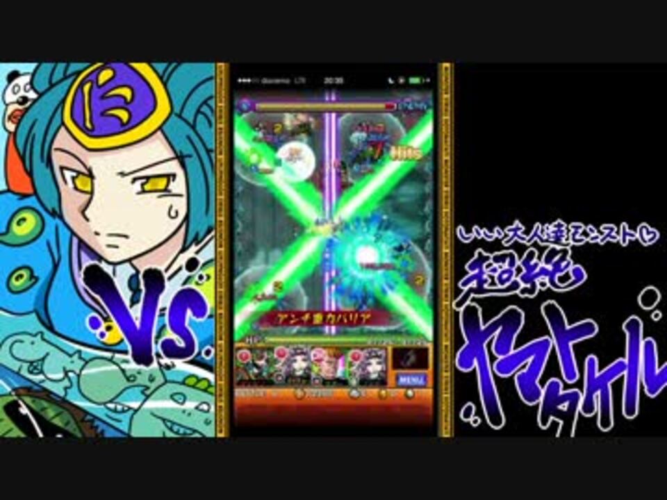 いい大人達が「モンスターストライク」の降臨クエスト<br>「水駆ける天叢雲の皇子(超絶)」を本気で遊んでみました。<br>ここまで見てくださった皆々様に感謝!<br><br><br>タイチョーのモンスト知識は大したこと無いのでスルーしてください。<br>また、該当クエスト実装直後の収録内容となっているため、現在の仕様と違う箇所が多々ございます。<br><br>登場人物:イラスト参照!<br><br>(ご注意!)タイチョーが大絶叫している箇所が多々あります。音量にご注意ください。<br>また、42:17あたりから尺余り(無音・無映像)が発生しております。ご了承下さい。<br><br>いい大人達チャンネルはこちらから⇒<a href="https://ch.nicovideo.jp/channel/ch2598414" target="_blank" rel="noopener">ch2598414</a><br><br>前→<a href="https://www.nicovideo.jp/watch/sm27659052" class="watch">sm27659052</a> これまでの実況→<a href="https://www.nicovideo.jp/mylist/17828031" target="_blank" rel="noopener">mylist/17828031</a> ラジオ→<a href="https://www.nicovideo.jp/mylist/28752088" target="_blank" rel="noopener">mylist/28752088</a>