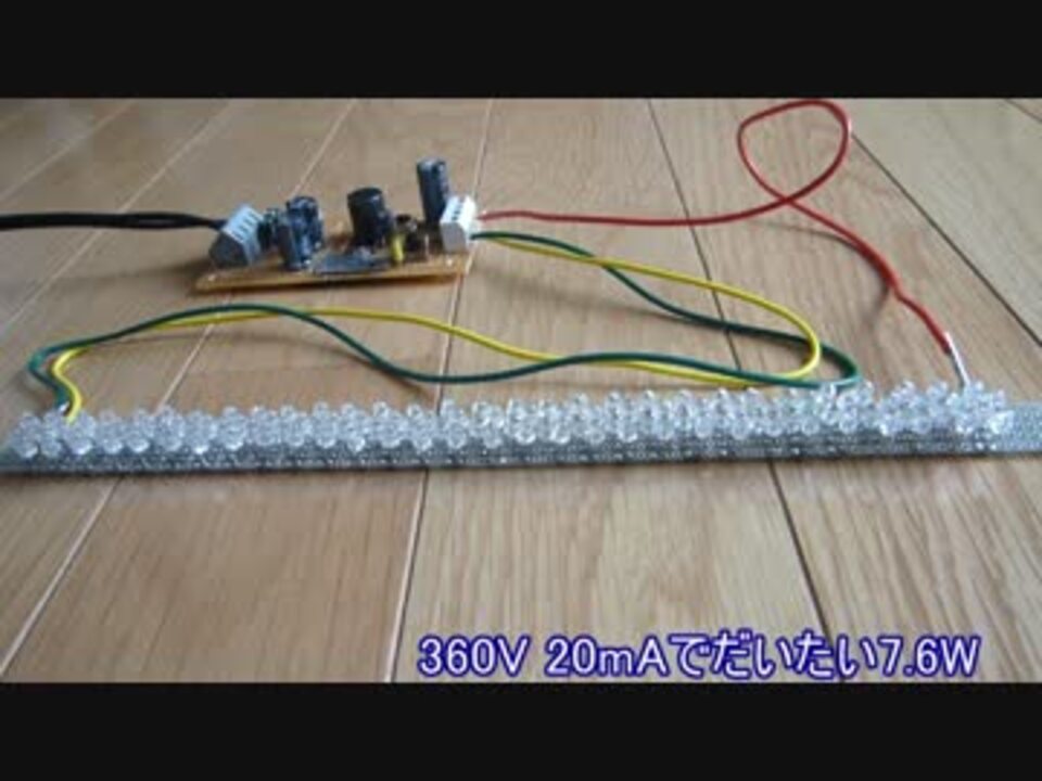 マルツで3mmφの白色LEDが100個500円で売られていました。1個のLEDは定格電力66mW。<br />100個直列、そして128個直列で点灯できる電子バラスト的な物を作ってみました。<br />商用交流100Vで動作し、20mAの定電流特性を持った400V超の直流を発生できる電源。<br />そのキーデバイスは2個100円のスイッチング電源IC、FSD210Bでした。<br /><br />効果音・BGMにつきましては <a href="https://commons.nicovideo.jp/works/nc10485" target="_blank" rel="noopener">nc10485</a> <a href="https://commons.nicovideo.jp/works/nc60009" target="_blank" rel="noopener">nc60009</a> <a href="https://www.nicovideo.jp/watch/sm12082606" class="watch">sm12082606</a> を使わせていただいております。<br /><br />設計に関する話を<a href="https://ch.nicovideo.jp/article/ar924206" target="_blank" rel="noopener">ar924206</a>に書いておきました。<br />それ以外の電子工作はこちら:<a href="https://www.nicovideo.jp/mylist/19060462" target="_blank" rel="noopener">mylist/19060462</a><br />低電圧大電流だから感電しない版(5~20V降圧チョッパ)も作りました:<a href="https://www.nicovideo.jp/watch/sm28656140" class="watch">sm28656140</a><br /><br />みどりちゃんは100個目と101個目の間で元気に暮らしております。それを含めれば129個。
