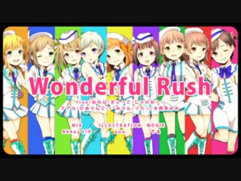 <b><font size="6"><font color="#00d3ff">(U^ェ^U)オワンダフル</font></font></b> <br /><br />μ'sのみなさん、紅白歌合戦出場おめでとうございます!<br />今回は、ラブライバー歌い手仲間で『Wonderful Rush』を歌ってみました!<br />一緒に楽しんでいただければ嬉しいです(੭ु ›ω‹ )੭ु⁾⁾♡ <br /><br />高坂穂乃果 リた☆ <a href="https://www.nicovideo.jp/mylist/31668693" target="_blank" rel="noopener">mylist/31668693</a><br />南ことり lino <a href="https://www.nicovideo.jp/mylist/6686337" target="_blank" rel="noopener">mylist/6686337</a><br />園田海未 きょーこ <a href="https://www.nicovideo.jp/mylist/14307901" target="_blank" rel="noopener">mylist/14307901</a><br />西木野真姫 おわん <a href="https://www.nicovideo.jp/mylist/12410697" target="_blank" rel="noopener">mylist/12410697</a><br />星空凛 <br />小泉花陽 大西あみみ <a href="https://www.nicovideo.jp/mylist/31667370" target="_blank" rel="noopener">mylist/31667370</a><br />絢瀬絵里 テアル <a href="https://www.nicovideo.jp/mylist/36813521" target="_blank" rel="noopener">mylist/36813521</a><br />東條希 ひめりんご <a href="https://www.nicovideo.jp/mylist/25333308" target="_blank" rel="noopener">mylist/25333308</a><br />矢澤にこ しゃけみー <a href="https://www.nicovideo.jp/mylist/30163780" target="_blank" rel="noopener">mylist/30163780</a><br /><br />illustration ann <a href="https://www.nicovideo.jp/mylist/54002440" target="_blank" rel="noopener">mylist/54002440</a><br />mix Akkey I/O <a href="https://www.nicovideo.jp/mylist/11139927" target="_blank" rel="noopener">mylist/11139927</a><br />movie てる <a href="https://www.nicovideo.jp/mylist/36539266" target="_blank" rel="noopener">mylist/36539266</a>