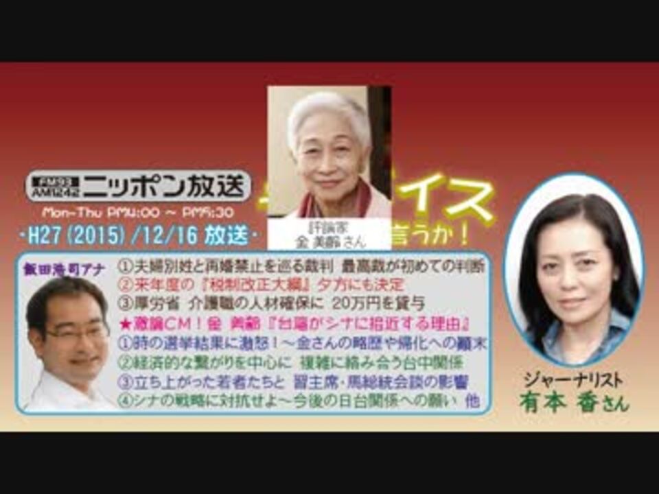 今回この週替わり枠を担当されたのは、2ヶ月前のスペシャルウィークと同じく有本香さんですが、それ以前にも何度か担当されてますし、もはやスペシャルウィークのレギュラーって感じですね(^^<br /><br />さて今回は、特別ゲストに、元台湾人であり、現在は日本に帰化された評論家・金美齢さんをお招きしての『親日国・台湾が、シナに接近する理由を暴く!』と題した対談が一番の目玉企画なわけですが、コメント的には、ニュース・ピックアップの1本目『夫婦別姓と再婚禁止を巡る裁判』の方が、5時台のニュースの所で流れた原告団の下品な物言いと併せて盛り上がりそうな気がします(^^;<br />というか、日台関係の重要性は、言わずもがなですからね!<br />※街ステ飛ばし→<a href="#" class="seekTime" data-seekTime="38:24" onclick="seekNicoPlayer('#38:24'); return false;">#38:24</a><br />□<a href="https://www.nicovideo.jp/mylist/50437895" target="_blank" rel="noopener">mylist/50437895</a>□<a href="https://www.nicovideo.jp/mylist/36340069" target="_blank" rel="noopener">mylist/36340069</a>□<a href="https://www.nicovideo.jp/mylist/41644857" target="_blank" rel="noopener">mylist/41644857</a>