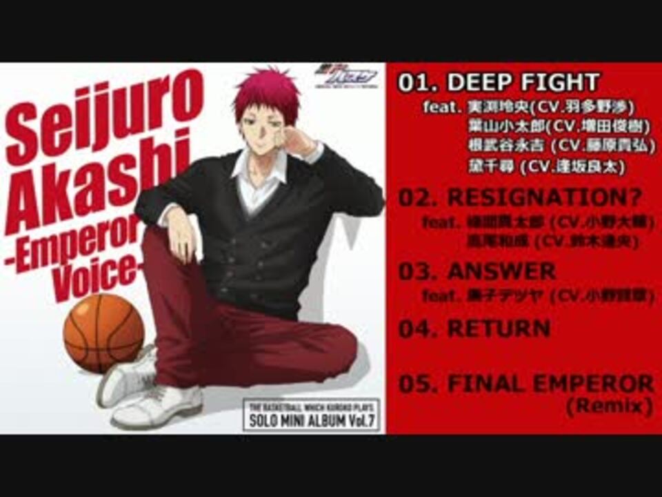 TVアニメ『黒子のバスケ』SOLO MINI ALBUM Vol.7<br />赤司征十郎 - Emperor Voice -<br />発売日:2015/12/20<br />赤司征十郎(CV.神谷浩史)<br /><br />1. DEEP FIGHT feat.実渕玲央(CV.羽多野渉) 葉山小太郎(CV.増田俊樹)<br /> 根武谷永吉(CV.藤原貴弘) 黛千尋(CV.逢坂良太)<br />2. RESIGNATION? feat.緑間真太郎(CV.小野大輔) 高尾和成(CV.鈴木達央)<br />3. ANSWER feat.黒子テツヤ(CV.小野賢章)<br />4. RETURN<br />5. FINAL EMPEROR ~Absolute Existence Remix~