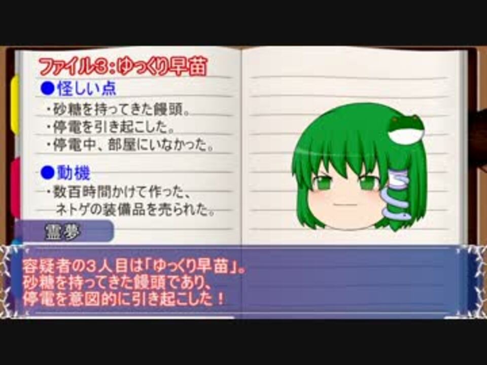 本格ミステリー、いざ作ってみると難しかったです。<br />皆に納得してもらえる作りにしないといけない、<br />しかしヒントは出しすぎてはいけない、<br />その匙加減が難しい!<br /><br />part1→<a href="https://www.nicovideo.jp/watch/sm27848319" class="watch">sm27848319</a> 前→<a href="https://www.nicovideo.jp/watch/sm27863262" class="watch">sm27863262</a> 次回作→<a href="https://www.nicovideo.jp/watch/sm28107707" class="watch">sm28107707</a><br />マイリスト→<a href="https://www.nicovideo.jp/mylist/54227207" target="_blank" rel="noopener">mylist/54227207</a><br />別作品マイリスト→<a href="https://www.nicovideo.jp/mylist/54227270" target="_blank" rel="noopener">mylist/54227270</a><br /><br />●お借りしたもの<br />【SE】<br />ザ・マッチメイカァズ2nd <a href="http://osabisi.sakura.ne.jp/m2/index.html" target="_blank" rel="noopener nofollow">http://osabisi.sakura.ne.jp/m2/index.html</a><br />On-Jin ~音人~ <a href="http://www.yen-soft.com/ssse/" target="_blank" rel="noopener nofollow">http://www.yen-soft.com/ssse/</a><br />【BGM】<br />-煉獄庭園- <a href="http://www.rengoku-teien.com/" target="_blank" rel="noopener nofollow">http://www.rengoku-teien.com/</a><br />H/MIX GALLERY <a href="http://www.hmix.net/" target="_blank" rel="noopener nofollow">http://www.hmix.net/</a><br /><a href="https://www.nicovideo.jp/watch/sm4203434" class="watch">sm4203434</a> <a href="https://www.nicovideo.jp/watch/sm19347196" class="watch">sm19347196</a>