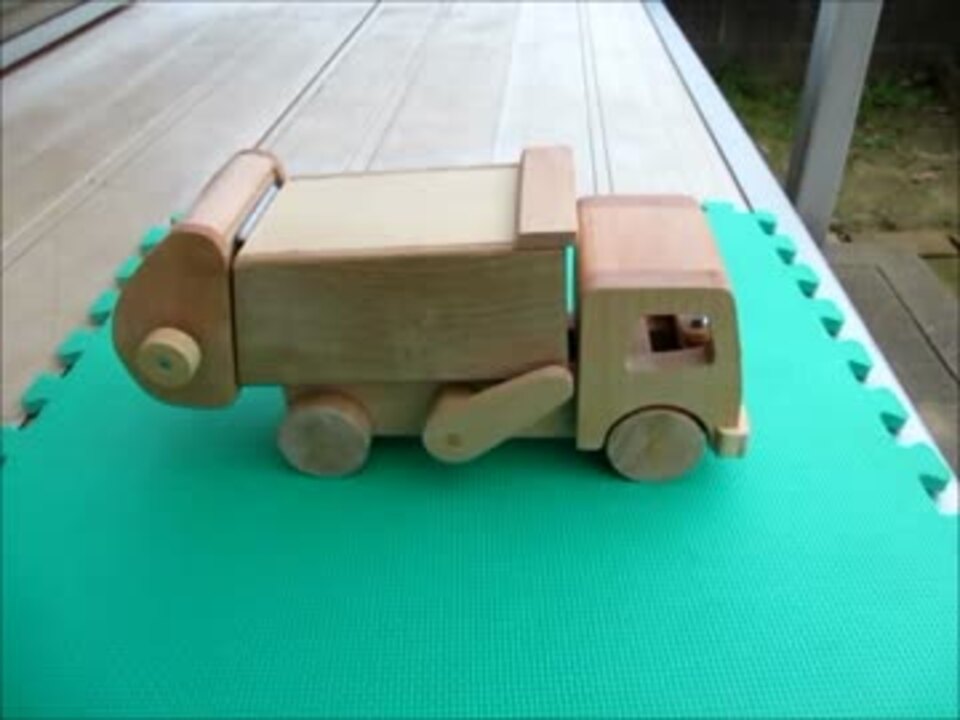 木のおもちゃ、働く自動車シリーズ「ゴミ収集車2号」完成。保育所の先生から、子どもが一番好きな働く自動車はゴミ収集車と聞き制作しました。日頃一番目にする機会が多い働く自動車で、ゴミを投入、本体に押し込まれていくメカが面白い。この部分と、焼却場のピットに落とし込むところが面白いので、そのところを重点に制作しました。どんぐりのゴミを収集、ゴミ焼却場に搬送、ピットのなかに投入