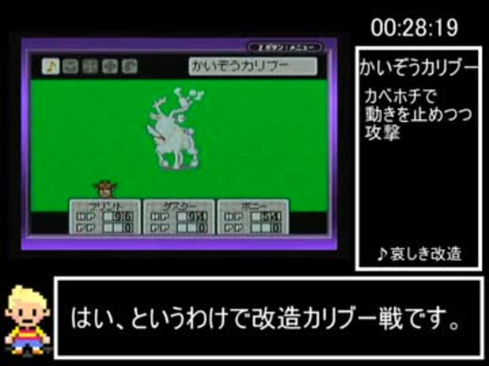 プレイ後にニコ生1位の記録を見て軽く絶望したので初投稿です<br>一般会員なんで画質微妙だけどゆるして<br>タイマーは後付けなので多少のズレがあると思いますがゆるして<br>ゲームスタート~かいぞうカリブー戦まで<br><br>使用機器GC、ゲームボーイプレーヤー、GCコントローラー<br><br>一般通過豚王兄貴、ほも日刊イトイ新聞兄貴、リールク兄貴、DSISN兄貴、kokku兄貴、elfen兄貴、とうりょ兄貴、muteLetter兄貴、宣伝アリシャス!<br>次→<a href="https://www.nicovideo.jp/watch/sm27970674" class="watch">sm27970674</a> MOTHER3マイリス→<a href="https://www.nicovideo.jp/mylist/54436846" target="_blank" rel="noopener">mylist/54436846</a><br>使わせていただいた動画→<a href="https://www.nicovideo.jp/watch/sm15771289" class="watch">sm15771289</a><br><br>『MOTHER3』10周年おめでとうございます<br><br>追記:ニコ生記録保持兄貴のブロマガを拝見しました。<br>俺のチャート無駄だらけじゃないか(絶望)<br><br>※この動画シリーズの一部または全部を外部サイト等に転載することを禁じます<br> 但し,動画紹介等の理由で動画の一部を引用することは認めます<br> すでにyoutubeにあるやつは無断転載です