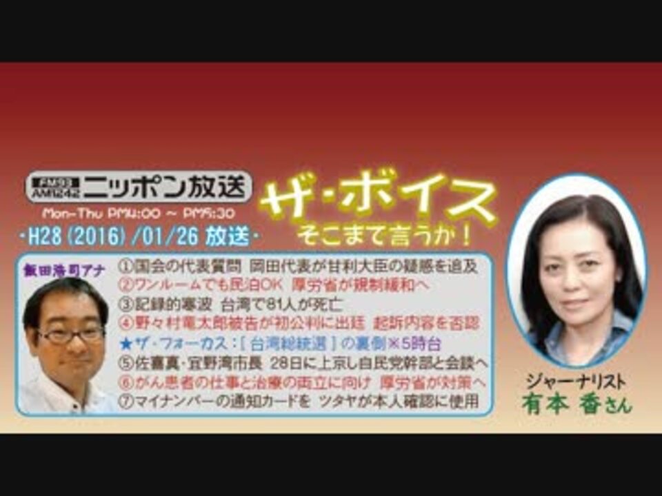 2本目の『民泊の規制緩和』について、その経緯や防犯面などから強い懸念を示された有本さんですが、私的には、そもそも"観光立国()"などという政策自体が気に入りませんw<br />いや、別に全く必要ないとは言いませんよ。でもね、内需が冷え込んでいるからと安易に外へ目を向けて、国内を冷えたままにしてどうすると。てか、何が「免税の品目を増やした成果もあり、過去最高の訪日客数と消費額を達成♪^^」だよ。それ、減税したら景気が良くなると証明してますよねw ~なのに自国民には増税でしばくとか、ほんと、どこ向いて政治やってんじゃい!<br /><br />~と現政権に怒っても、民主・岡田代表ら野党の迷演説がそれを打ち消すという……はぁ(^^;<br />※街ステ飛ばし→<a href="#" class="seekTime" data-seekTime="36:51" onclick="seekNicoPlayer('#36:51'); return false;">#36:51</a><br />□<a href="https://www.nicovideo.jp/mylist/50437895" target="_blank" rel="noopener">mylist/50437895</a>□<a href="https://www.nicovideo.jp/mylist/36340069" target="_blank" rel="noopener">mylist/36340069</a>□<a href="https://www.nicovideo.jp/mylist/41644857" target="_blank" rel="noopener">mylist/41644857</a>