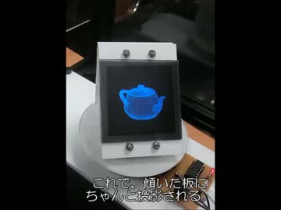 板を高速回転+プロジェクタで同期投影のタイプです。モーターとプロジェクタ1個でできます。<br /><br />【関連】<br />元ネタ: Interactive 360º Light Field Display:<br /><a href="http://gl.ict.usc.edu/Research/3DDisplay/" target="_blank" rel="noopener nofollow">http://gl.ict.usc.edu/Research/3DDisplay/</a> <br /><br />有機ELディスプレイを回すタイプ(RayModeler):<br /><a href="https://www.youtube.com/watch?v=yS0_3Sql-5E" target="_blank" rel="noopener nofollow">https://www.youtube.com/watch?v=yS0_3Sql-5E</a><br />普通のディスプレイをそのまま回すタイプ(くるくるディスプレイ):<br /><a href="https://www.youtube.com/watch?v=nfpG6G1csEk" target="_blank" rel="noopener nofollow">https://www.youtube.com/watch?v=nfpG6G1csEk</a><br />巨大なテレビを回すタイプ(ぐるぐるディスプレイ):<br /><a href="https://www.youtube.com/watch?v=69xsG5mwLoI" target="_blank" rel="noopener nofollow">https://www.youtube.com/watch?v=69xsG5mwLoI</a><br />-----<br /><br />これまでつくったもの:<br />将棋ロボ <a href="http://www.nicovideo.jp/watch/sm23291568" target="_blank" rel="noopener nofollow">http://www.nicovideo.jp/watch/sm23291568</a>