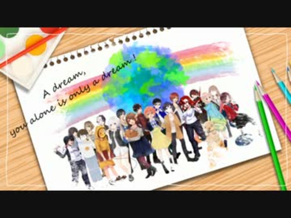 描け!それぞれの絵の具で描く夢<br /><br />◆本家様:SINGERS【<a href="https://www.nicovideo.jp/watch/sm27404771" class="watch">sm27404771</a>】<br /> VOCALOIDS【<a href="https://www.nicovideo.jp/watch/sm27399621" class="watch">sm27399621</a>】<br /> (詞・曲:halyosy様)<br /><br />◆企画、MIX:はまひろ(企画詳細、裏話→<a href="https://ch.nicovideo.jp/article/ar959422" target="_blank" rel="noopener">ar959422</a>)<br /><br />◆歌:はまひろ(<a href="https://www.nicovideo.jp/user/472146" target="_blank" rel="noopener">user/472146</a>) うらら(<a href="https://www.nicovideo.jp/user/3937975" target="_blank" rel="noopener">user/3937975</a>) 夏村(<a href="https://www.nicovideo.jp/user/35559401" target="_blank" rel="noopener">user/35559401</a>) 楽描小人(<a href="https://www.nicovideo.jp/user/2819059" target="_blank" rel="noopener">user/2819059</a>)<br /> He_Low(<a href="https://www.nicovideo.jp/user/19138791" target="_blank" rel="noopener">user/19138791</a>) あう(<a href="https://www.nicovideo.jp/user/11221678" target="_blank" rel="noopener">user/11221678</a>) れいちゃる(<a href="https://www.nicovideo.jp/user/6295770" target="_blank" rel="noopener">user/6295770</a>)<br /> 皆川直(<a href="https://www.nicovideo.jp/user/3599761" target="_blank" rel="noopener">user/3599761</a>) リた☆(<a href="https://www.nicovideo.jp/user/8926251" target="_blank" rel="noopener">user/8926251</a>) グル美(<a href="https://www.nicovideo.jp/user/182572" target="_blank" rel="noopener">user/182572</a>)<br /><br />◆絵:夢乃(@yumeno23) 紺ふゆこ(<a href="https://www.nicovideo.jp/user/24213221" target="_blank" rel="noopener">user/24213221</a>) RN5◀(<a href="https://www.nicovideo.jp/user/27624545" target="_blank" rel="noopener">user/27624545</a>) 崎(<a href="https://www.nicovideo.jp/user/15561753" target="_blank" rel="noopener">user/15561753</a>)<br /> 泉茶(<a href="https://www.nicovideo.jp/user/26121868" target="_blank" rel="noopener">user/26121868</a>) いずみ妃夜(@izumi_piyo) まりのすけ(<a href="https://www.nicovideo.jp/user/17850714" target="_blank" rel="noopener">user/17850714</a>)<br /> 悠(<a href="https://www.nicovideo.jp/user/148233" target="_blank" rel="noopener">user/148233</a>) 楽描小人 +α<br /><br />◆レアキャラ:しゅんたろす(<a href="https://www.nicovideo.jp/user/6154518" target="_blank" rel="noopener">user/6154518</a>)<br />◆動画:とーこ(<a href="https://www.nicovideo.jp/user/1534948" target="_blank" rel="noopener">user/1534948</a>)<br /><br />※誠に勝手ながら一部歌詞を改変させて頂いております