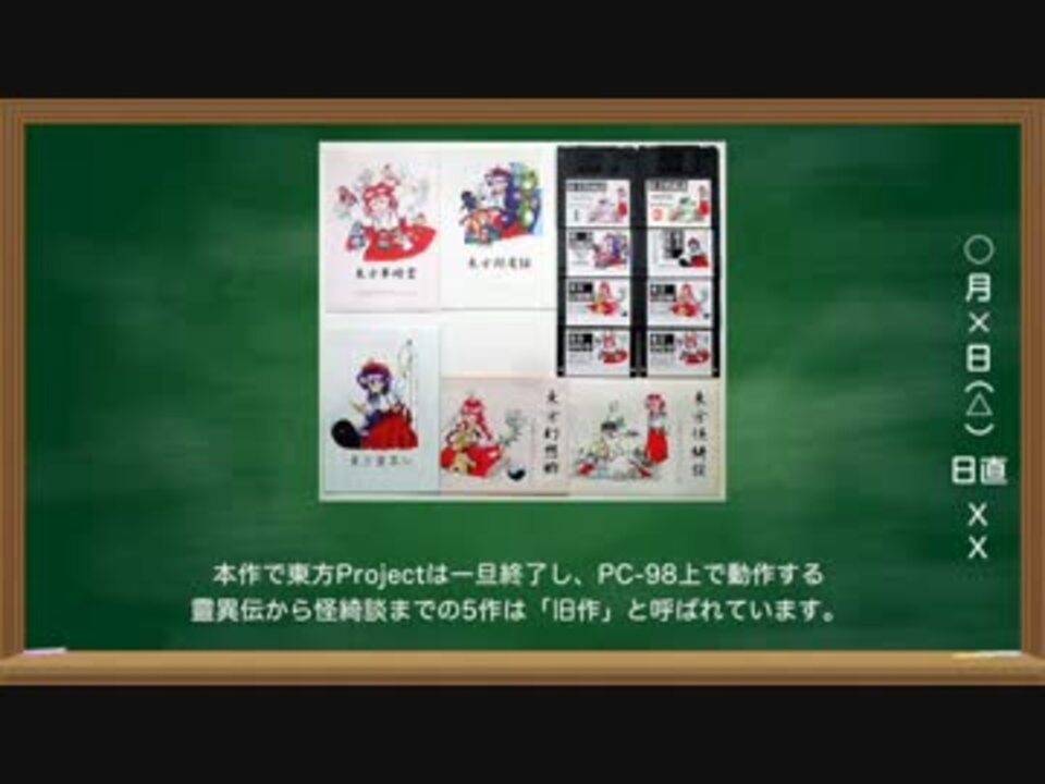 東方Projectの20年間を振り返る動画です。<br />今回は1995〜2004(靈異伝〜萃夢想・夢違科学世紀)までになります。<br />冒頭のイラストは羽々斬さんのものを使用させていただきました。<br /> (<a href="http://www.pixiv.net/member_illust.php?mode=medium&illust_id=54285262)" target="_blank" rel="noopener nofollow">http://www.pixiv.net/member_illust.php?mode=medium&illust_id=54285262)</a><br />中編 → <a href="https://www.nicovideo.jp/watch/sm28375643" class="watch">sm28375643</a><br />後編 → <a href="https://www.nicovideo.jp/watch/sm28400912" class="watch">sm28400912</a><br /><br />投稿動画(<a href="https://www.nicovideo.jp/mylist/47352802" target="_blank" rel="noopener">mylist/47352802</a>)
