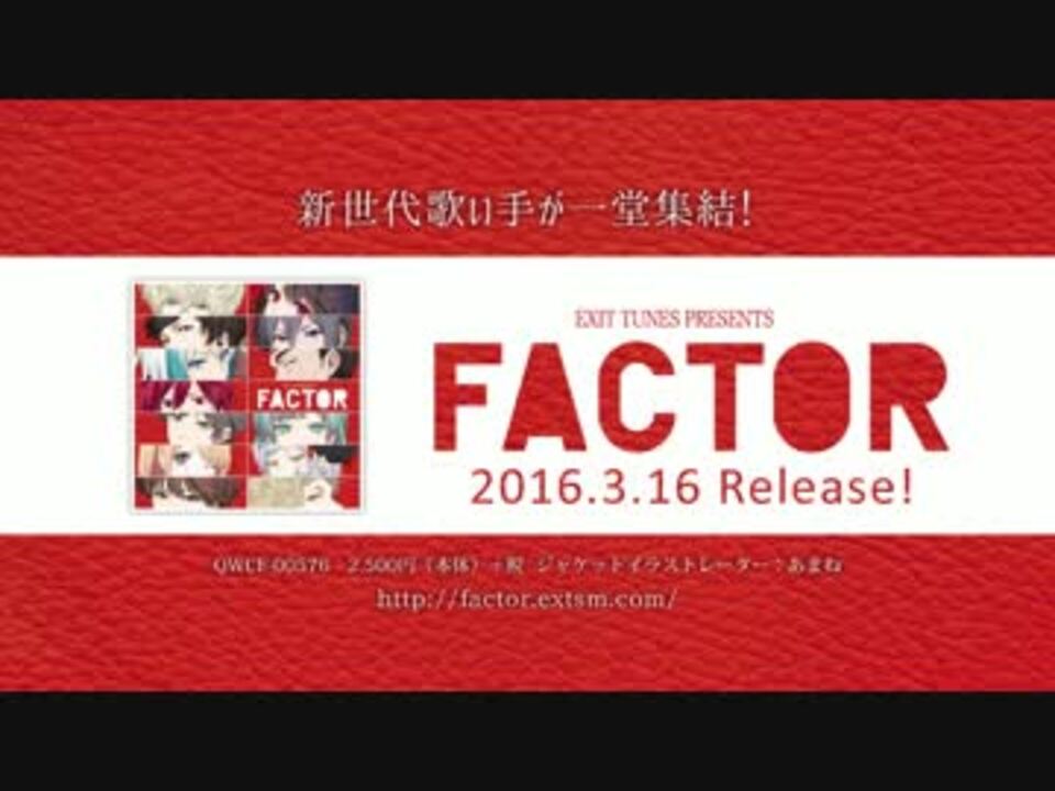 新世代歌い手が一堂集結!<br /><br />2016年3月16日(水)発売!<br />QWCE-00576<br />2,500円(本体)+税<br />ジャケットイラストレーター:あまね<br /><br /><br />【参加歌い手】<br />くろくも、あらき、影縫英、shack、えるの、めいちゃん、SILVANA、ゐづ、つかさし、3部、スヤ、黎一朗、りむかいちょ<br /><br />総勢13名の新世代歌い手たちによるコンピレーションアルバム!<br />今一番ホットな彼らの歌を1枚に凝縮!<br /><br />公式サイト:<a href="http://factor.extsm.com/" target="_blank" rel="noopener nofollow">http://factor.extsm.com/</a> <br />特典情報:<a href="http://factor.extsm.com/gift" target="_blank" rel="noopener nofollow">http://factor.extsm.com/gift</a> <br />リリイベ情報:<a href="http://factor.extsm.com/event" target="_blank" rel="noopener nofollow">http://factor.extsm.com/event</a> <br /><br />※特典内容・デザインは変更になる場合がございます。<br />※特典は非売品です。